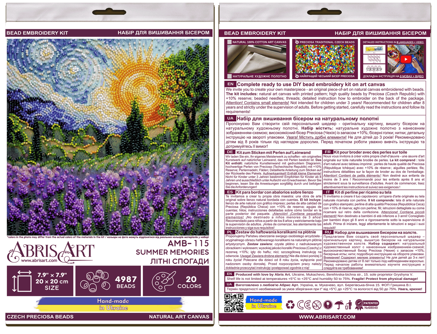 In each carefully assembled box Mid-sized bead embroidery kit Summer memories (Deco Scenes) after purchase and delivery you will find: a large piece of natural art canvas with a printed image-scheme (fabric for embroidery) larger than the size of the picture - 200 x 200 mm. - with enough stock to make it convenient to embroider and design the finished picture! The world's best beads Preciosa Ornela (Czech Republic), with "stock" - more than 4987 beads, high-quality bead needles from Japan , and most importantly - detailed instructions, the scheme for beadwork with a key, specially developed by our designers for each plot separately and already applied to the canvas!