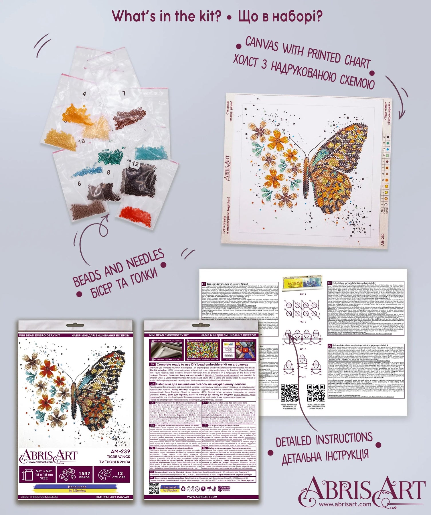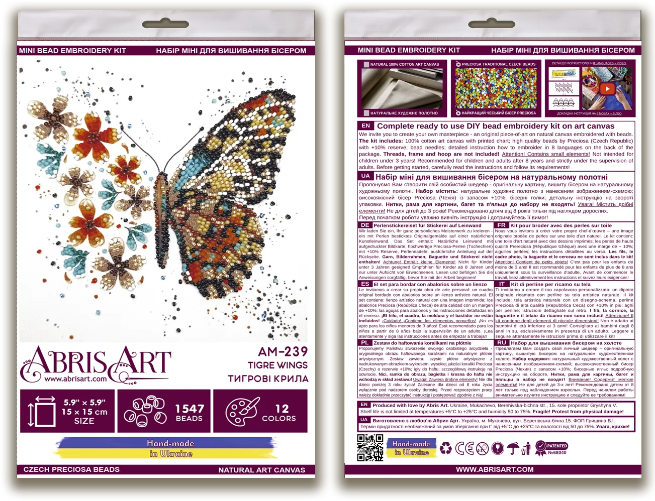 In each carefully assembled box Mini Bead embroidery kit Tigre wings after purchase and delivery you will find: a large piece of natural art canvas with a printed image-scheme (fabric for embroidery) larger than the size of the picture - 150 x 150 mm. - with enough stock to make it convenient to embroider and design the finished picture! The world's best beads Preciosa Ornela (Czech Republic), with "stock" - more than 1547 beads, high-quality bead needles from Japan , and most importantly - detailed instructions, the scheme for beadwork with a key, specially developed by our designers for each plot separately and already applied to the canvas! (12 colours), Dimensions 15*15cm / 5,9*5,9in. Made in Ukraine.