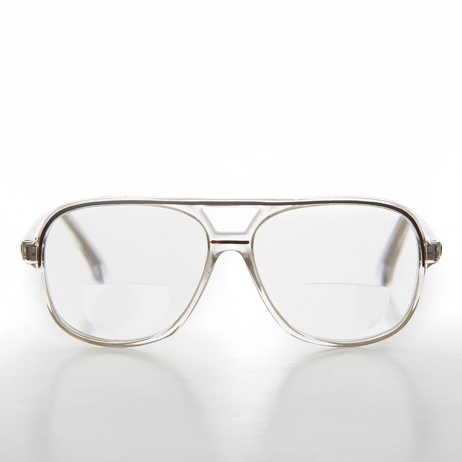 This bifocal aviator features a clear frame with color accents.