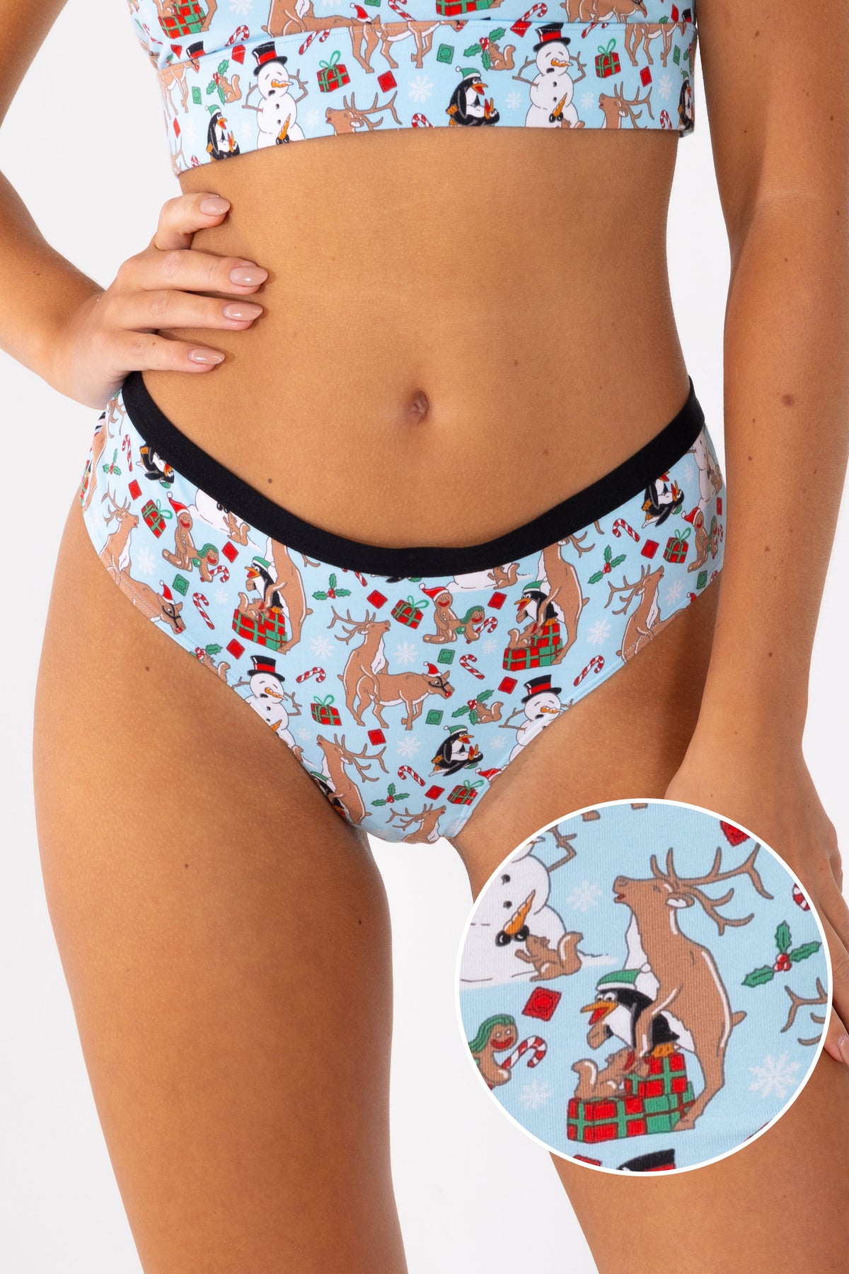 Ever wonder what happens at the North Pole while Santa’s out delivering presents? Let’s just say some boxes are definitely getting stuffed with toys. The yuletide orgy on these cheeky undies definitely puts the XXX in Xmas.