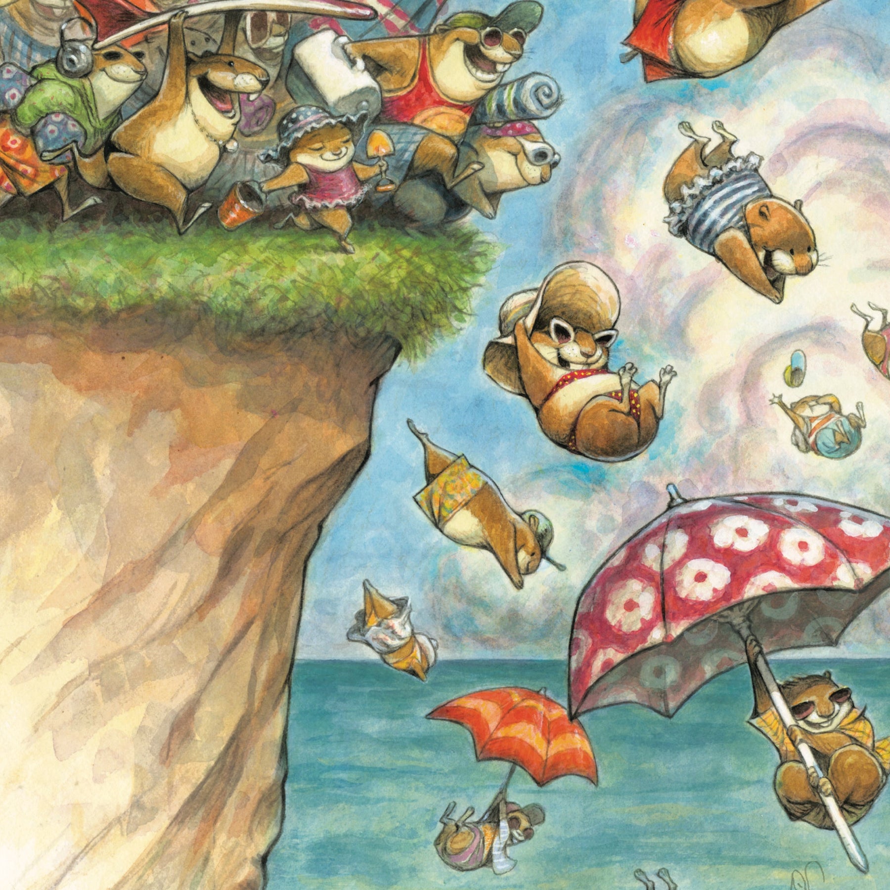 Excited beachgoing lemmings rush the beach with swimsuits, umbrellas, beachballs and all, eager to jump in the water and cool down on a sizzling July afternoon.