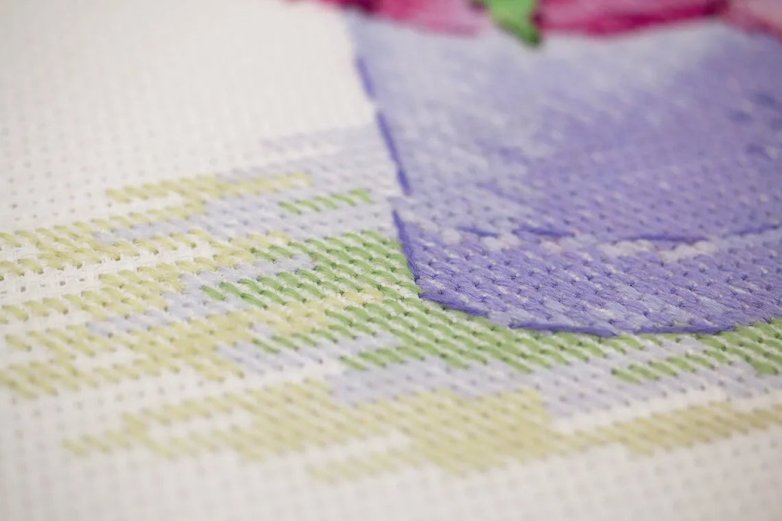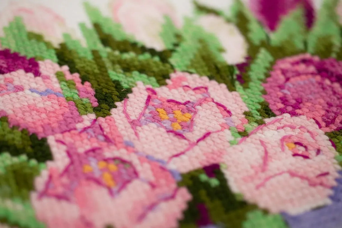 Kit contains: Canvas Zweigart 14ct. white AIDA, treads: wool/acrylic 22 colors. Instruction, color chart, needle 1 type. Dimensions 20*20cm/7¾" x 7¾"inches.