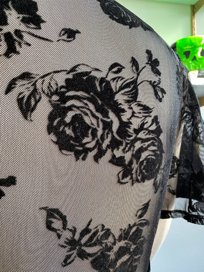 The Lydia Dress that started it all is making a comeback!The Flocked Black Rose Lydia Wrap Dress is a luxurious and timeless statement piece crafted in delicate black mesh with a flocked rose pattern. Enjoy the drama and glamour of this gorgeous dress, a guaranteed head-turner perfect for any special occasion! This style is a true wrap dress, with flutter sleeves and a dramatic, full skirt. Pairs perfectly with our Lydia slips or a catsuit! We even love this with a bra and black bike shorts! - ANNNND it has pockets!