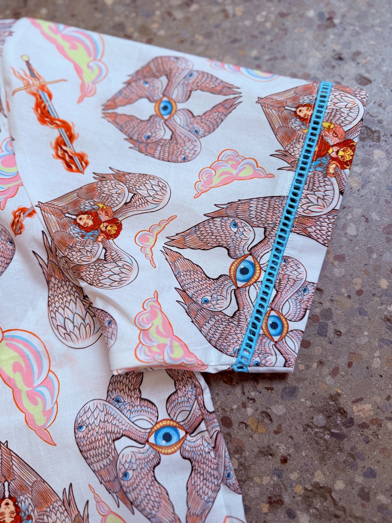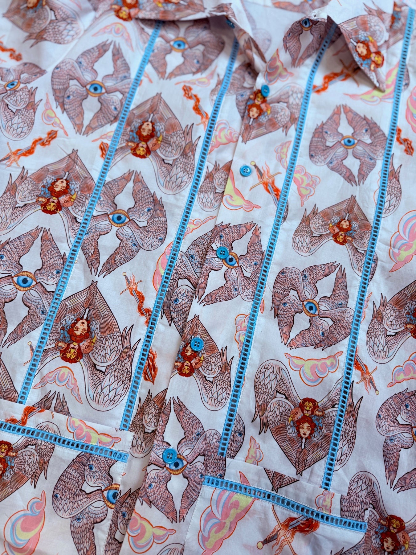 The new Men's Heavenly Bodies Cocktail Shirt is anything but scary. We're more than a little obsessed with this artwork, created exclusively for Wax Poetic by Philadelphia illustrator Kaitlin O'Donnell! This 100% cotton shirt is breathable, with bright blue trim and buttons, pockets, and a digital print that ensures longevity! This style is meant to be slightly oversized, if you'd like it to be more fitted we recommend sizing down.