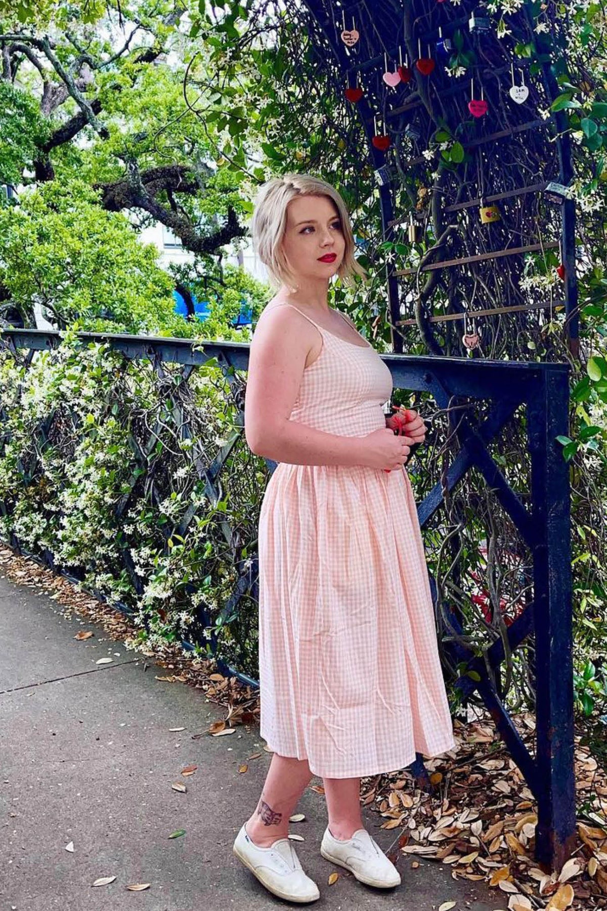 We're bringing back our popular Sandra dress in a gorgeous peach gingham print! This fit and flare midi-length dress has pockets (!!), adjustable straps, and a sturdy center-back metal zipper. Pair this dress with one of our belts to complete the look.