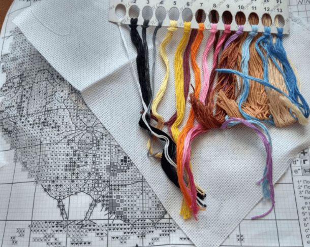 Mouline threads: 100% cotton, 20 colours. Chart: Symbolic Black and White. Needle and Instruction in English, French, German, Spanish, Italian and Russian. Completion: Partial cross stitch and background is not stitched.