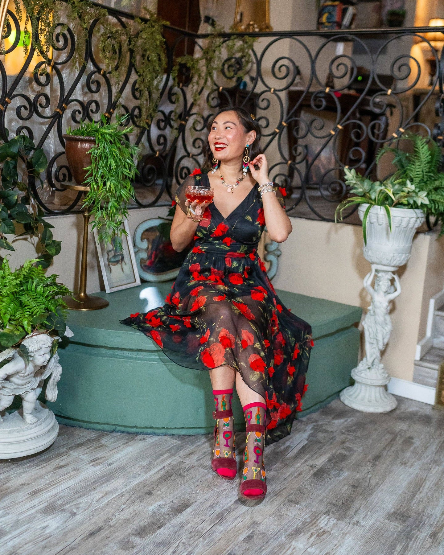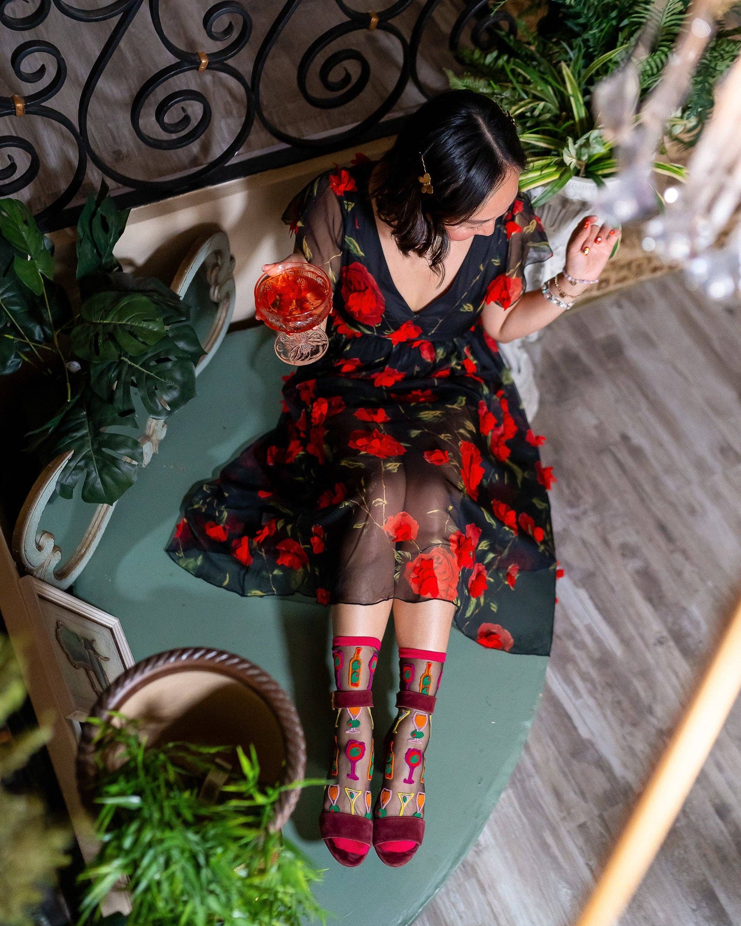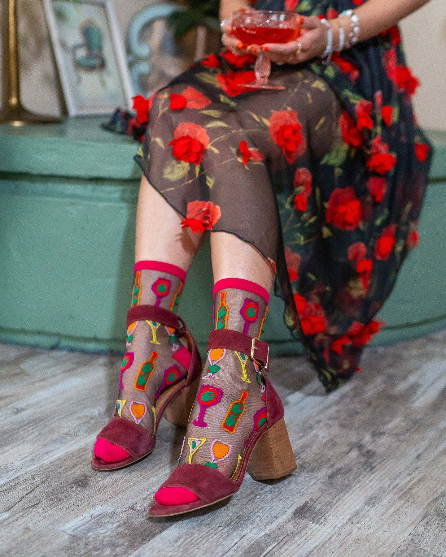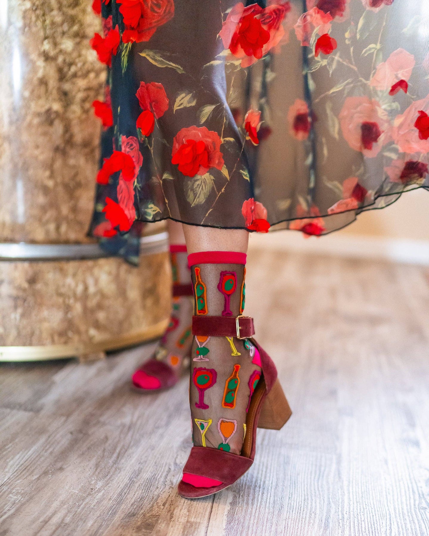 Our Cocktail Hour black sheer sock features wine glasses, martinis, and wine bottles with an unexpected olive twist. The graphic print and electrifying colors give this sock an art museum vibe, perfect for paint and sip nights with the girls. Finished with a mulberry colored cuff, heel, and toe for a sultry look. One Size. Recommended fit US women's shoe sizes 5.5-10. 200 Needle Count. ✨ Funky yet elegant - no silly or childish patterns 🧦 Premium quality - durably made with comfortable stretch 👗 Unique - the perfect accessory to add individuality to your outfits