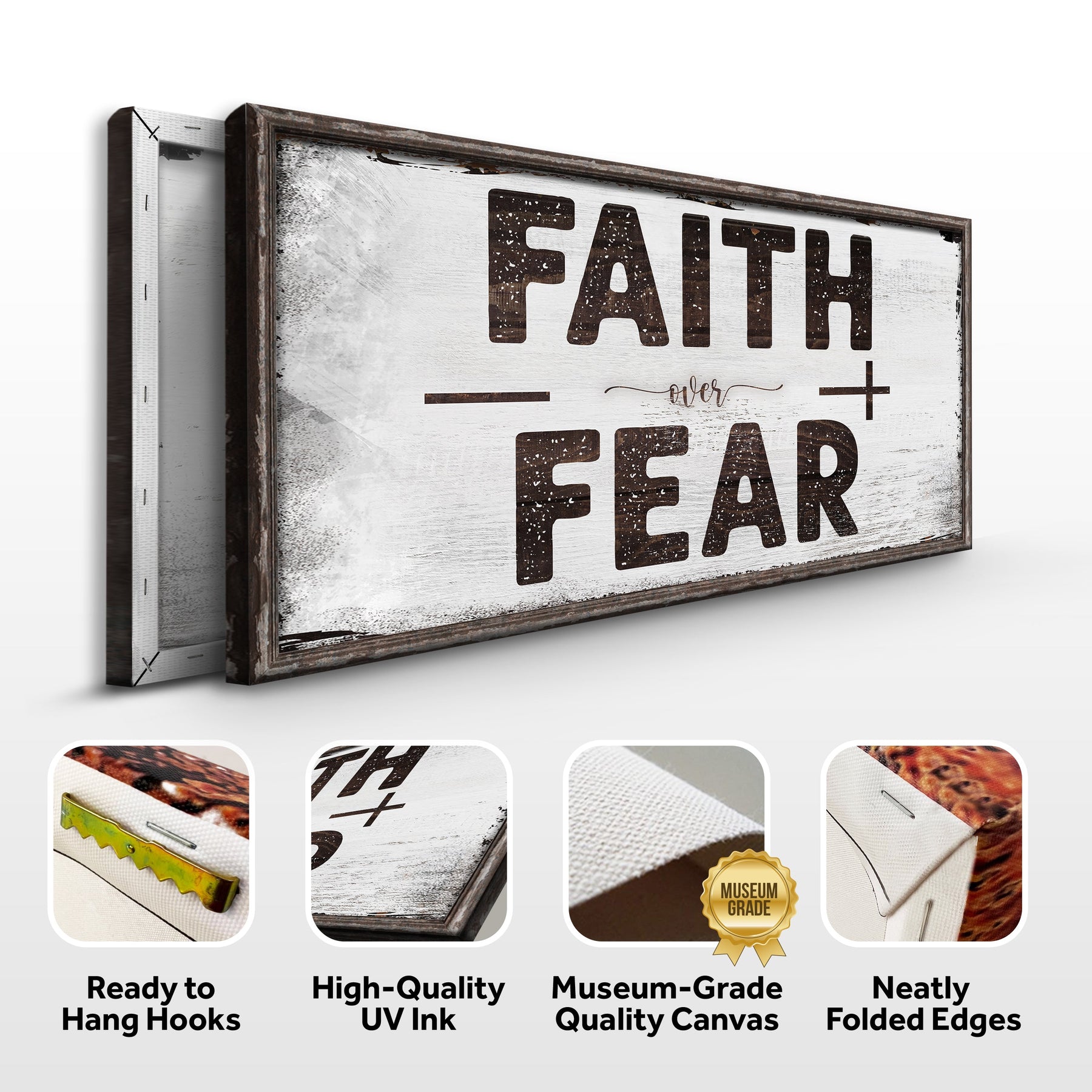 Each piece comes ready to hang, so you must unpack it and place it on your wall. Add this Faith Over Fear canvas print to your walls, and watch as it elevates the style and value of any room.