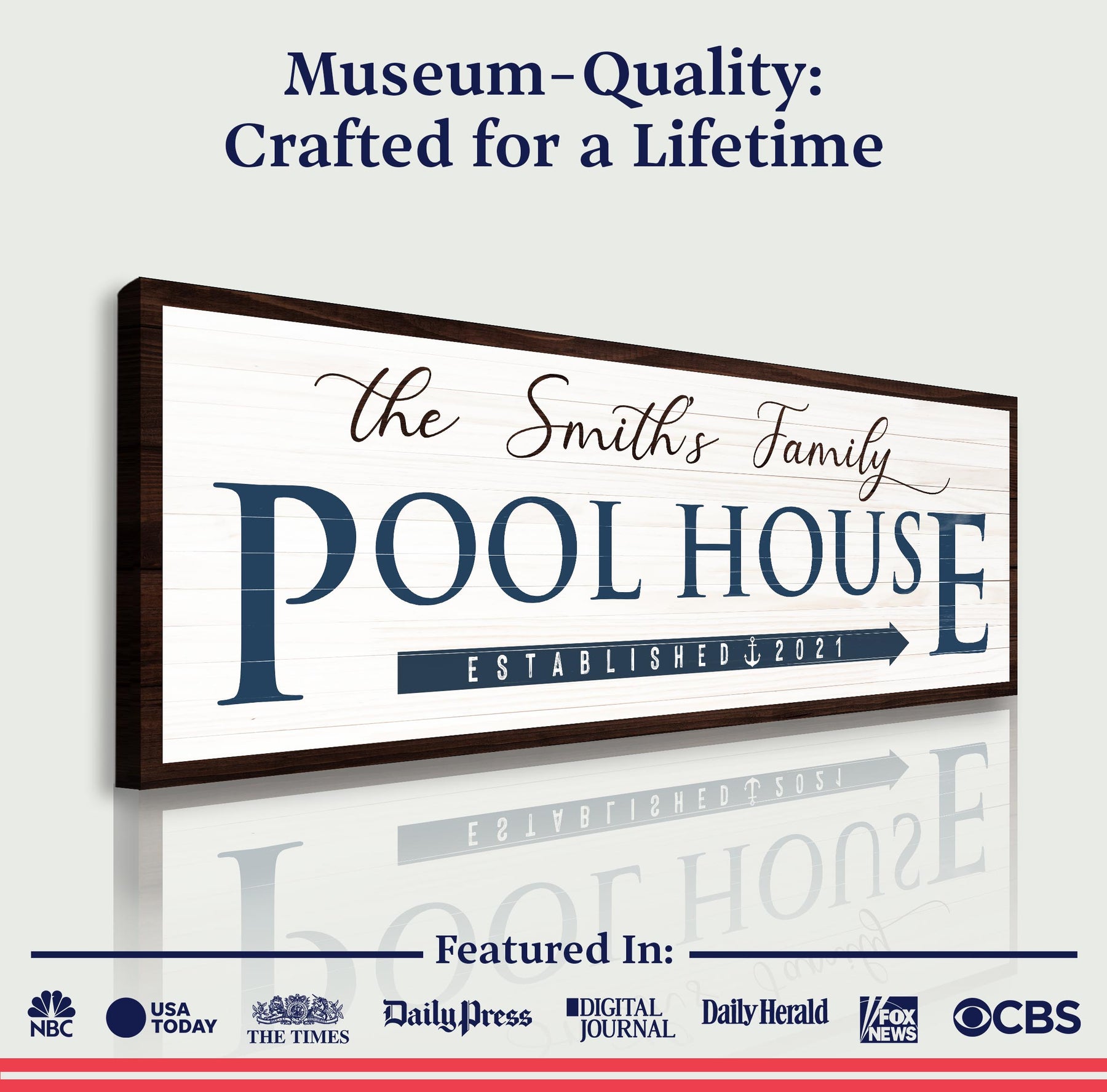A pool house is perfect for relaxing and enjoying time with family and friends. But why settle for a dull, cookie-cutter pool house when you can have a stylish and unique one? Family Pool House Sign print offers various options to make your pool house your own. Choose from three sizes, each with a different background color. Then add your Family name, custom text, and even an optional photograph. Family Pool House Sign wall art will help you create a pool house that's uniquely yours - and sure to envy your neighborhood. So get creative and make your Family Pool House canvas wall art today!