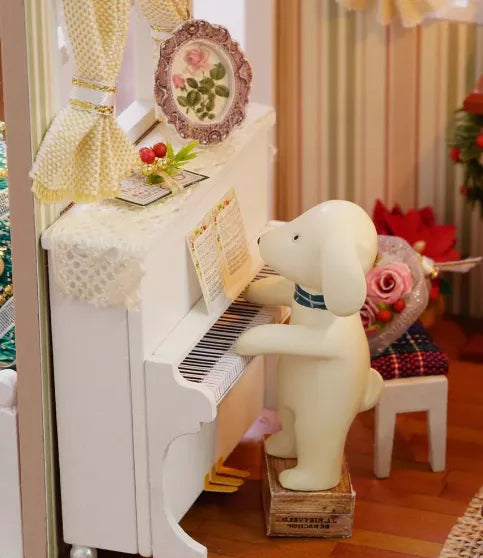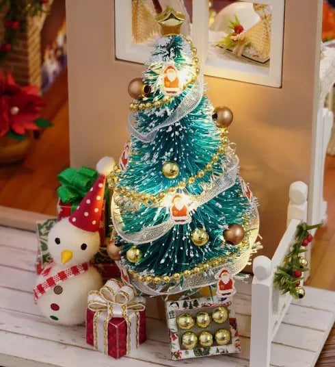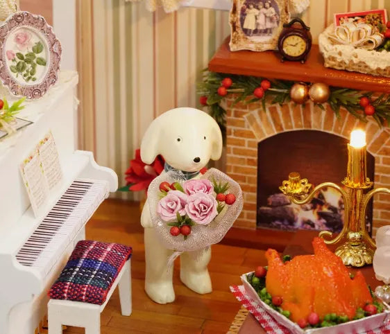 Introducing the cozy hut roombox, a miniature room kit perfect for crafting enthusiasts. This adorable roombox features a quaint living space with a comfortable white sofa, a rustic coffee table, and a warm lit fireplace. The room is beautifully decorated with floral wallpaper, framed artwork, and shelves filled with books and decor. A charming wreath adorns the entrance, and the room is illuminated by a ceiling fan light and a table lamp, creating a cozy ambiance. The kit includes all necessary components and detailed instructions for assembly, making it a delightful project to bring a touch of miniature magic to your home.