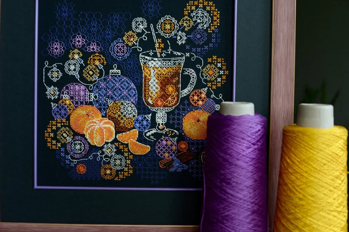 Kit contains: Canvas Zweigart 14ct. black AIDA, treads: Anchor stranded cotton 9 colors. Instruction, color chart, needle 1 type. Dimensions 30*30cm/11¾" x 11¾"inches.