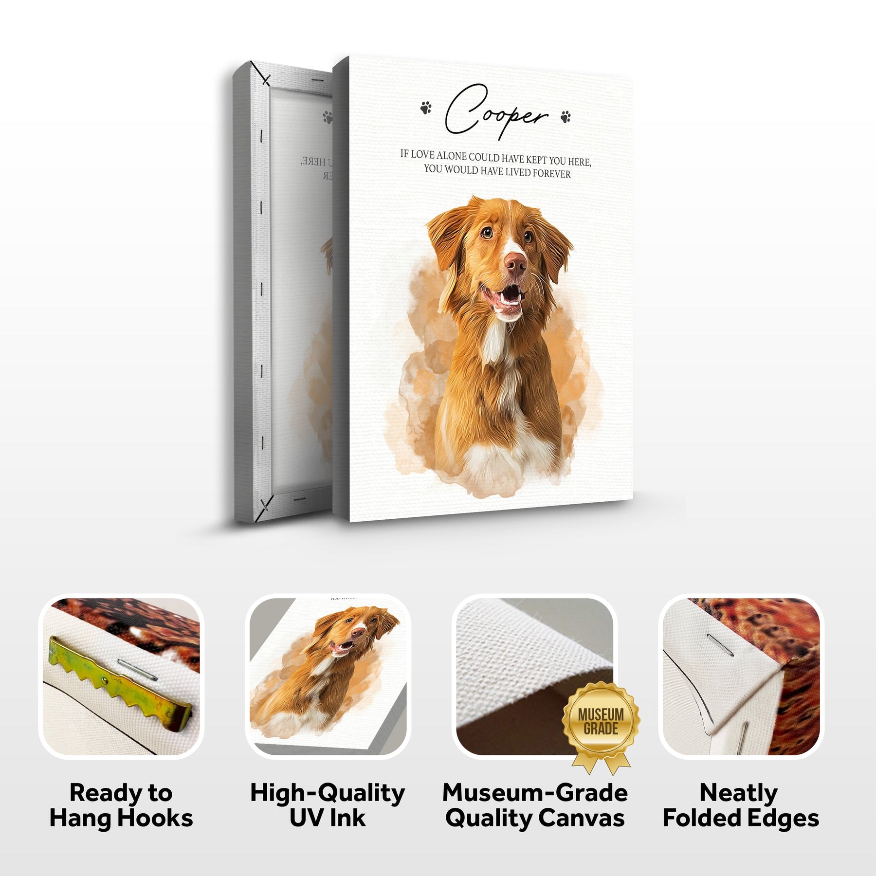 Let the memory of your beloved family member live on with this custom dog memorial pet loss frame portrait. Take comfort in the elegant wood patterns that will complement any photo canvas for any home décor style. Hang this passing gift in your pet's favorite room as a fitting tribute to the happy memories that you once shared.