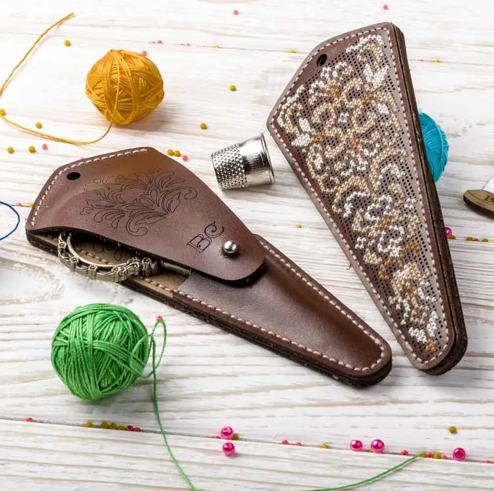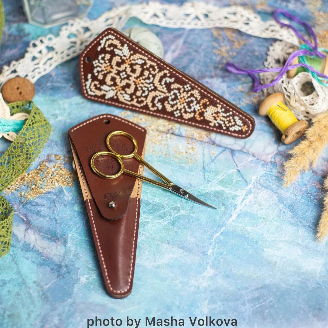 Scissors are necessary and irreplaceable thing in the arsenal of any craftswoman! However, scissors have a wayward character, because their sharp blades can not only cut fabric, thread or paper, but also damage things during transportation or even cut their owner. Therefore, it’s better to keep and transport them in a reliable case that will protect the outside world from scissors & scissors from the outside world. Such covers were developed by the specialists of "Wonderland Crafts" company! However, they were developed by our specialists, but it’s up to you, our dear friends, to embroider & assemble the finished product! Indeed, for a real craftswoman even accessories should be unusual and remind others of the high status of their owner! In the kits from "Wonderland Crafts" you will find absolutely everything you need to embroider and assemble a stunning artificial leather case! All you need is scissors and a little patience!