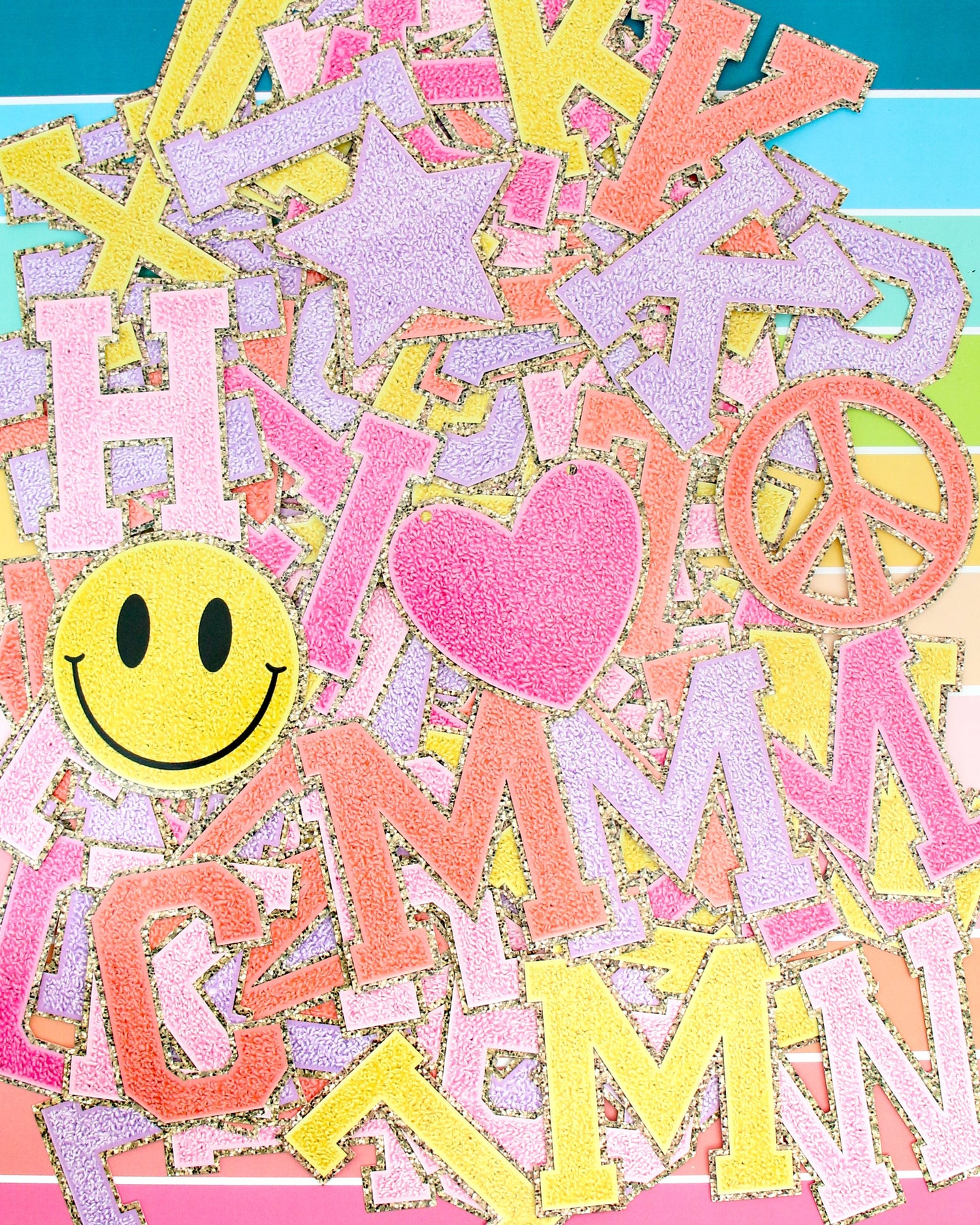 5 sets of alphabet letters in 5 different colors. Plus smiley face, hashtag, peace sign, heart, and star shapes. Use the included twine to string up your own custom phrase for your party.