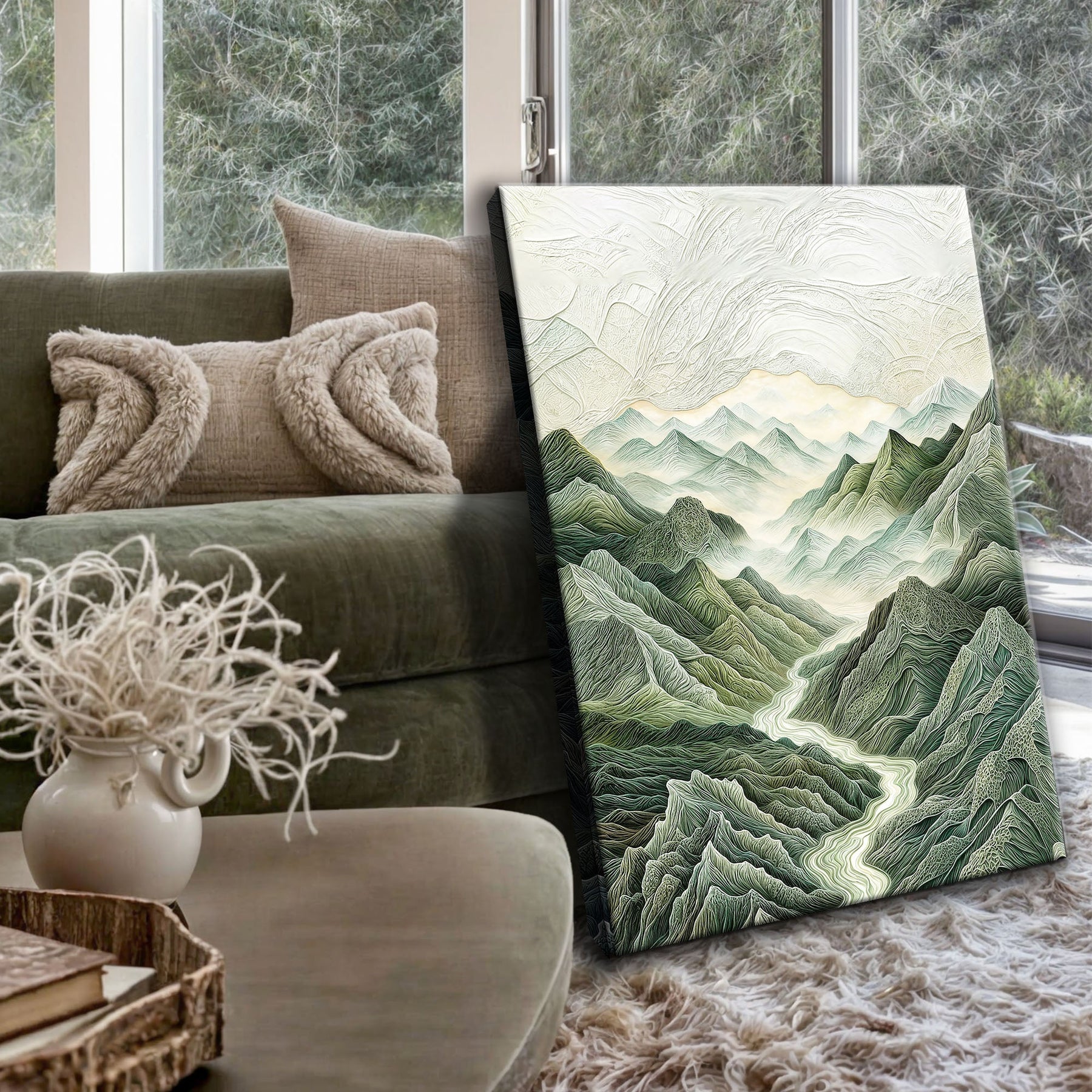 Bring the beauty of nature into your space with this stunning abstract landscape canvas, featuring majestic mountains, lush forests, and a flowing river. Designed with soft earthy tones, gold accents, and fluid brushstrokes, this artwork evokes a sense of tranquility and harmony, making it a perfect focal point for any room.