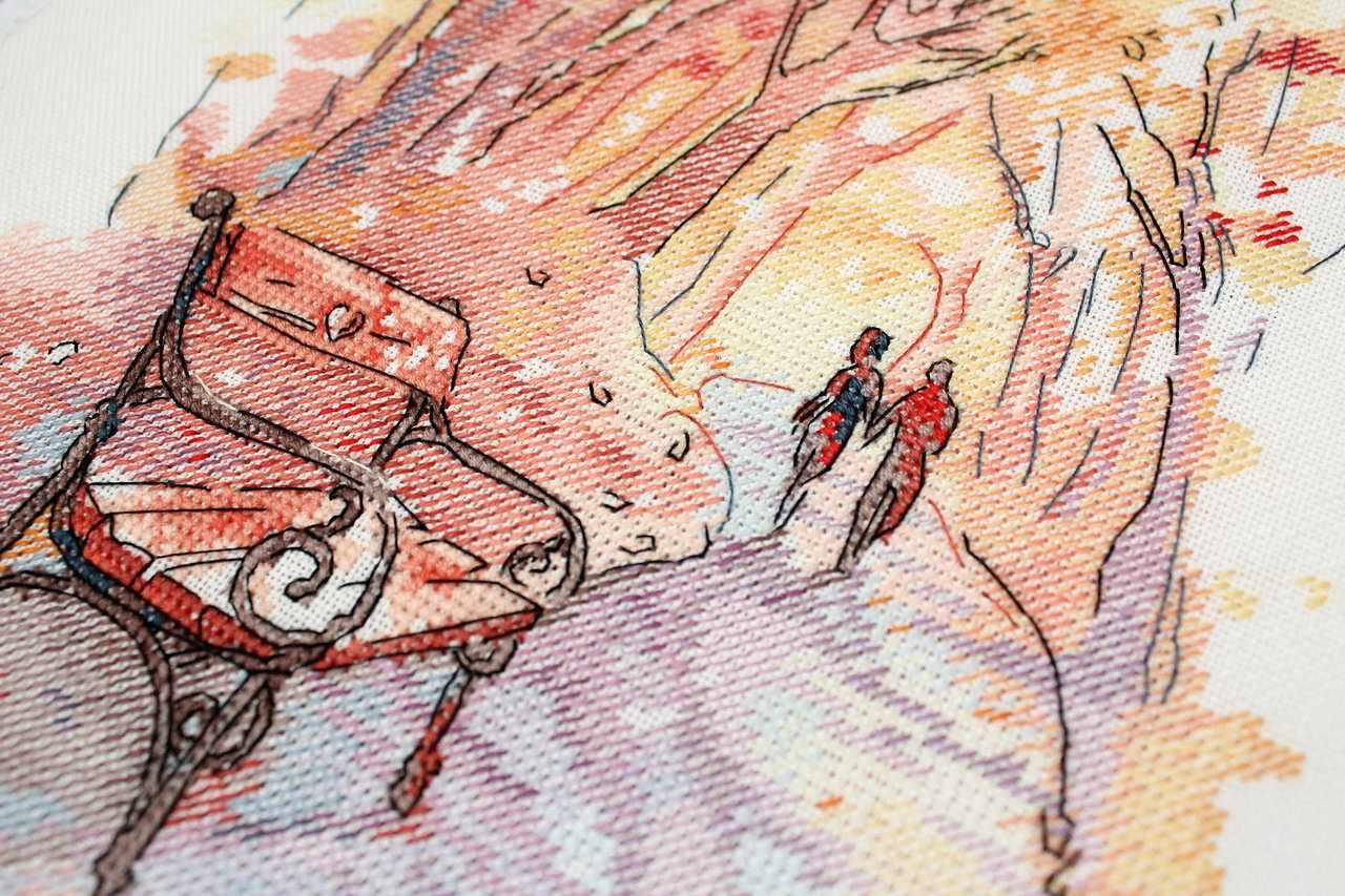 MP Studia counted cross-stitch set. This kit is stitched 27 count Linda canvas and DMC floss. Aquarelle Autumn park with walking couple in love. This autumn forest  can be your next cross stitch project.