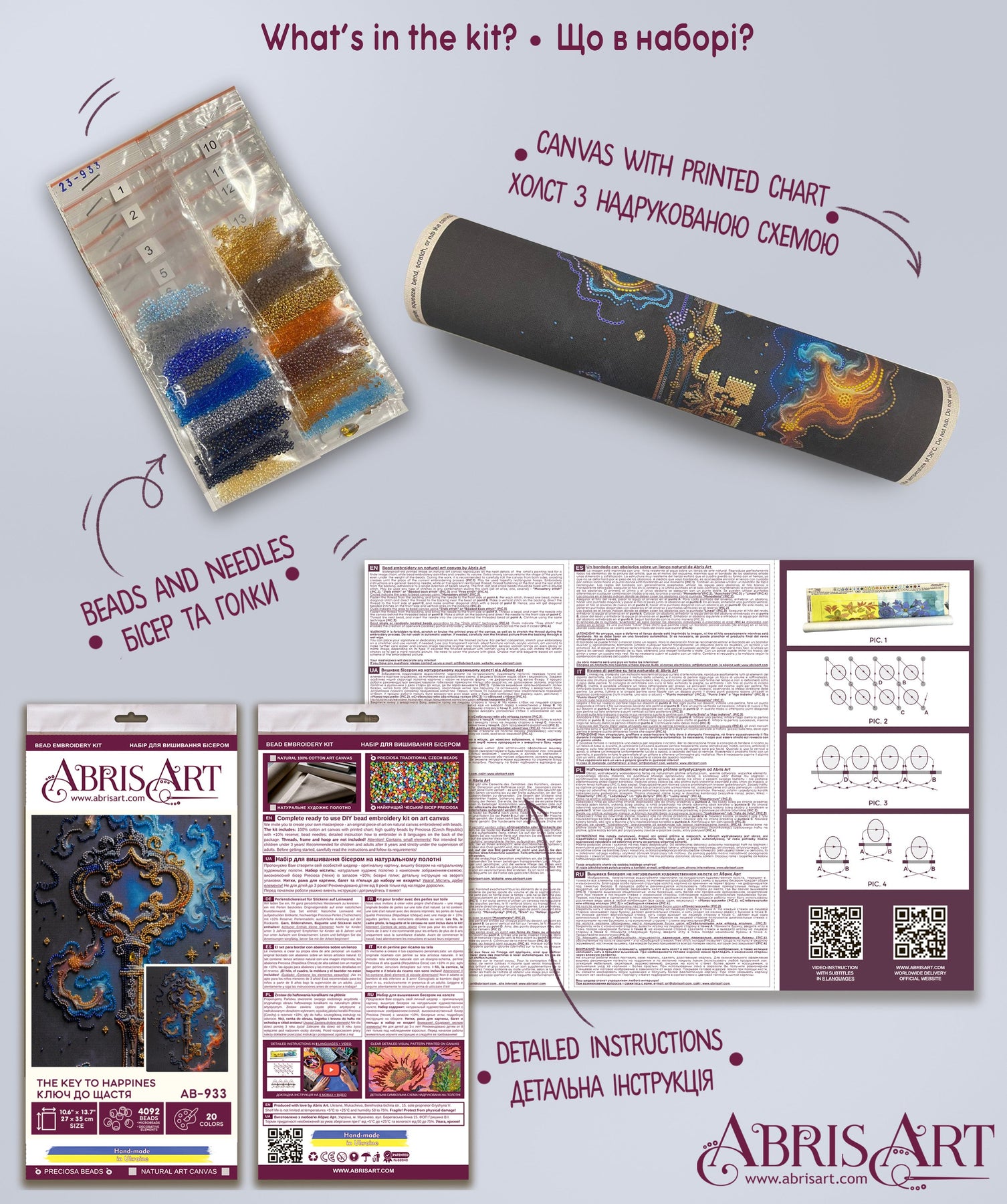 In each carefully assembled box Main Bead Embroidery Kit The key to happiness (Deco Scenes) after purchase and delivery you will find: a large piece of natural art canvas with a printed image-scheme (fabric for embroidery) larger than the size of the picture - 350 x 270 mm. - with enough stock to make it convenient to embroider and design the finished picture! The world's best beads Preciosa Ornela (Czech Republic), with "stock" - more than 4092 beads, high-quality bead needles from Japan , and most importantly - detailed instructions, the scheme for beadwork with a key, specially developed by our designers for each plot separately and already applied to the canvas!