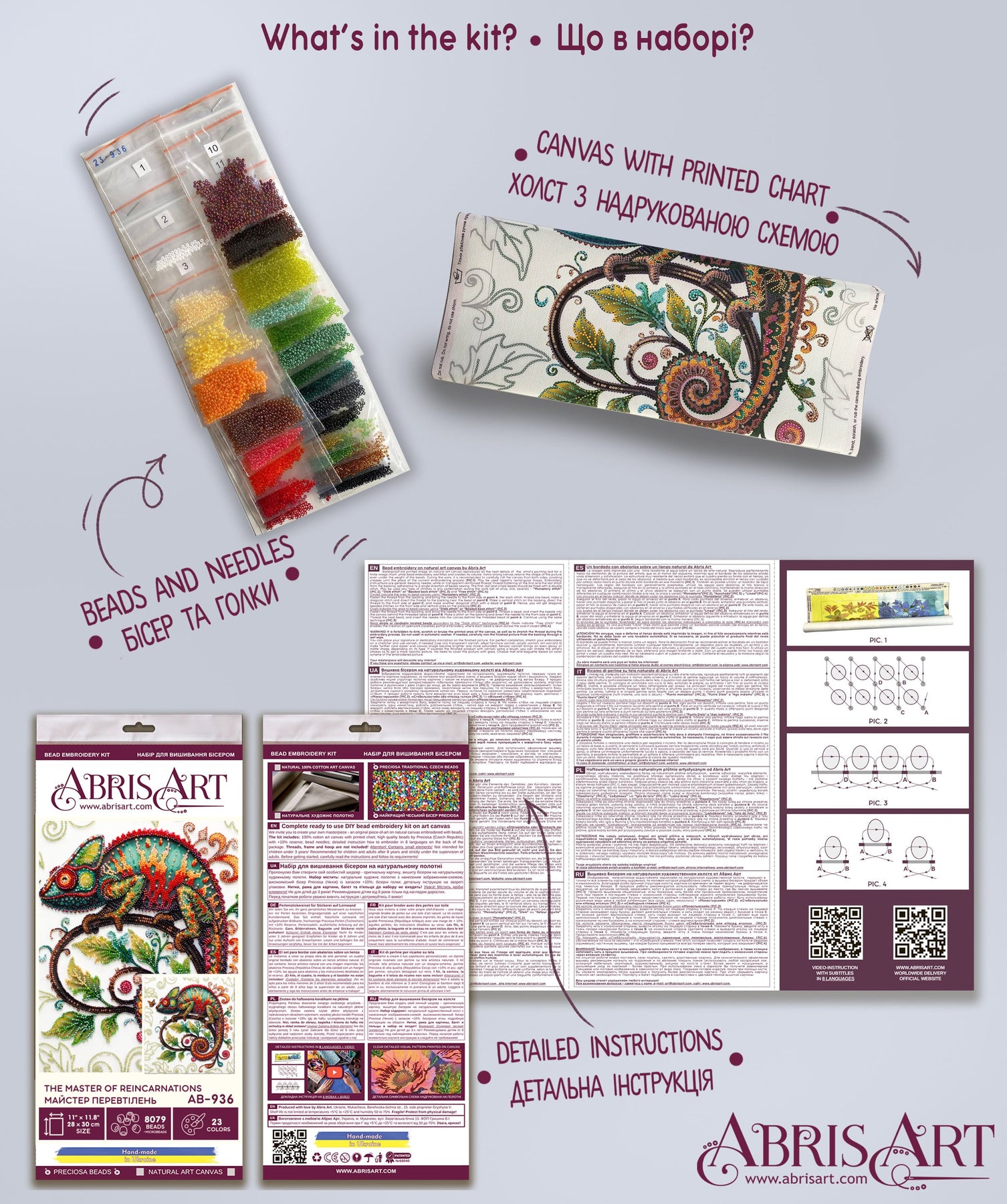 In each carefully assembled box Main Bead Embroidery Kit The master of reincarnations (Deco Scenes) after purchase and delivery you will find: a large piece of natural art canvas with a printed image-scheme (fabric for embroidery) larger than the size of the picture - 300 x 280 mm. - with enough stock to make it convenient to embroider and design the finished picture! The world's best beads Preciosa Ornela (Czech Republic), with "stock" - more than 8079 beads, high-quality bead needles from Japan , and most importantly - detailed instructions, the scheme for beadwork with a key, specially developed by our designers for each plot separately and already applied to the canvas!
