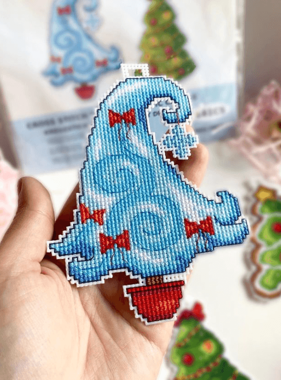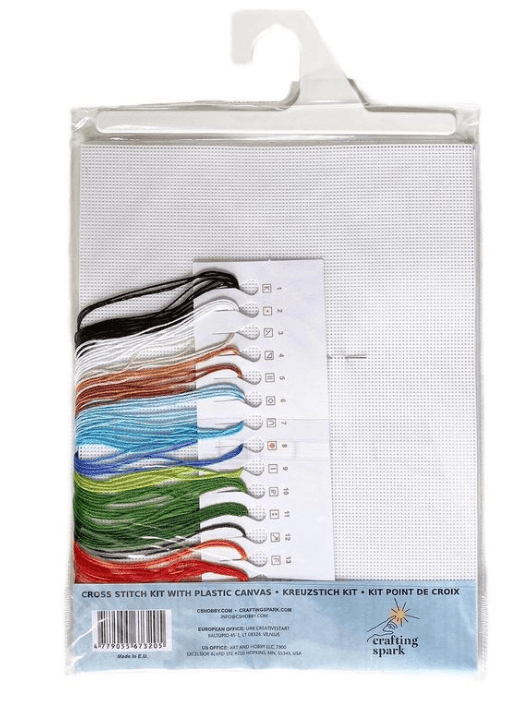 Kit contains: plastic canvas white, one sheet size 21x28cm / 8.27x11.02in /14 ct, 6-ply stranded cotton precuts (100% cotton) 17 colors, needle, chart/instruction. Dimensions set of 4 designs 9x12.5, 8.5x13, 9.5x13, 8x11 cm/ 3.54x4.92, 3.35x5.12, 3.74x5.12, 3.15x4.33 inches
