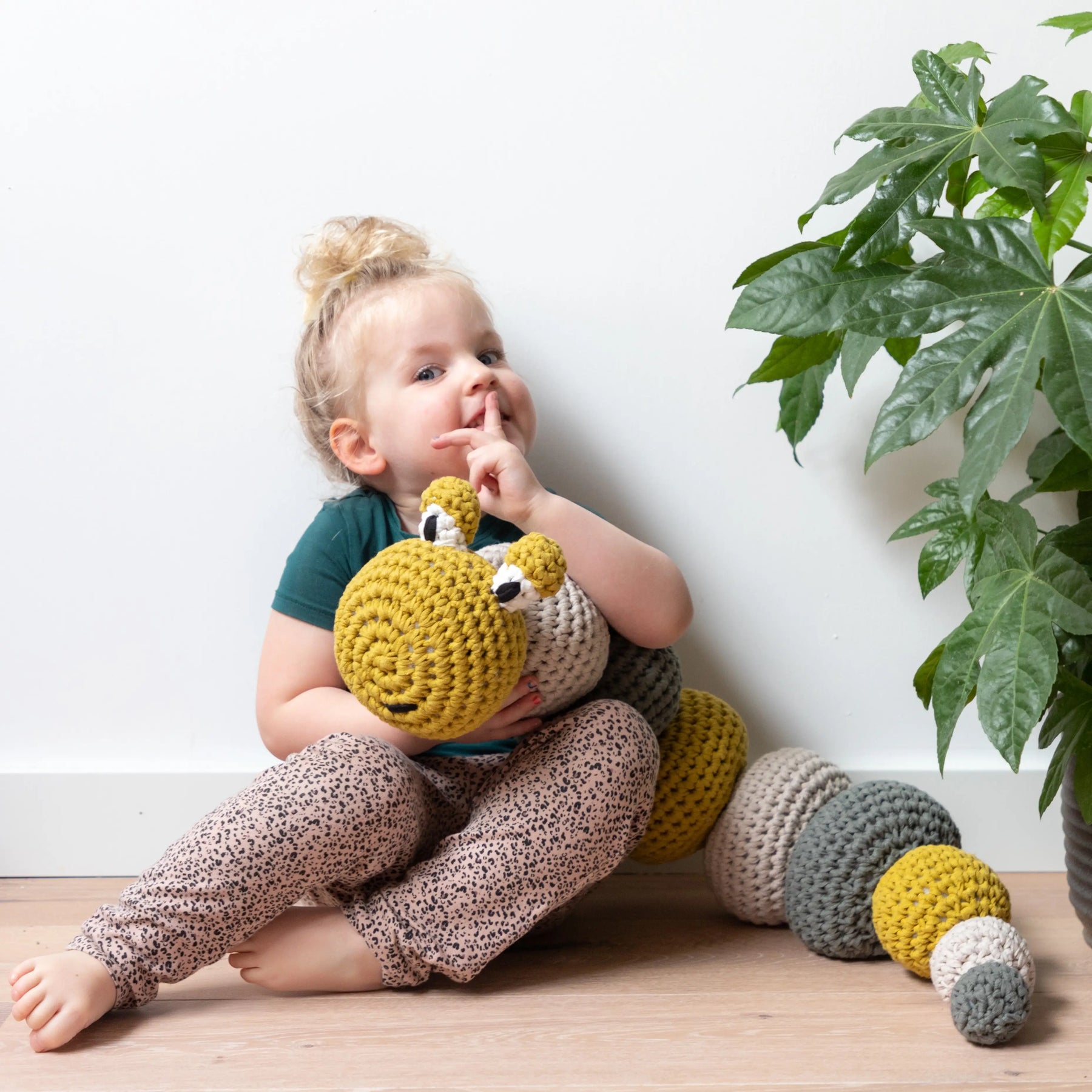 Get started and crochet this cheerful caterpillar, or two! Caterpillar Lola is best friends with Clark and Louise. These cute caterpillars are ideal as a door stopper for a children's rooms or just as a cuddly companion. We crocheted the caterpillar with RibbonXL, in 3 different colours. The last step is filling them with cotton filling or anything similar.