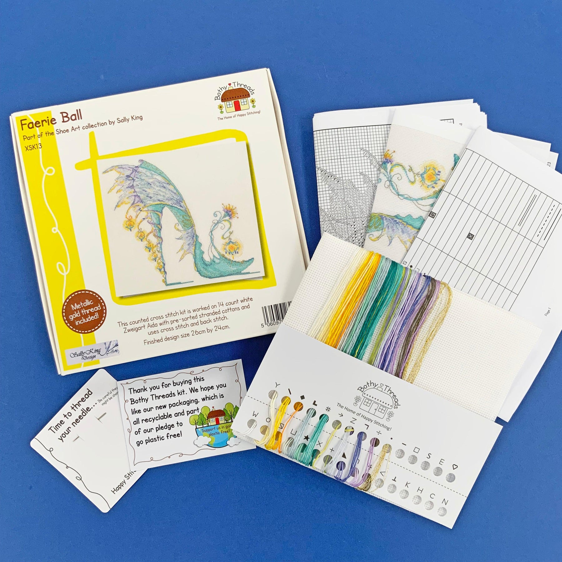 This counted cross stitch kit is worked on 14 count white Zweigart Aida with pre-sorted stranded cottons and uses cross stitch and back stitch. This kit also includes metallic threads, a needle and a clear chart and instructions. The finished design size is 26cm by 24cm. This design is part of the Shoe Art Collection and is based on original artwork by Sally King . Dimensions 26 x 24cm/ 10,24 x 9,45inches