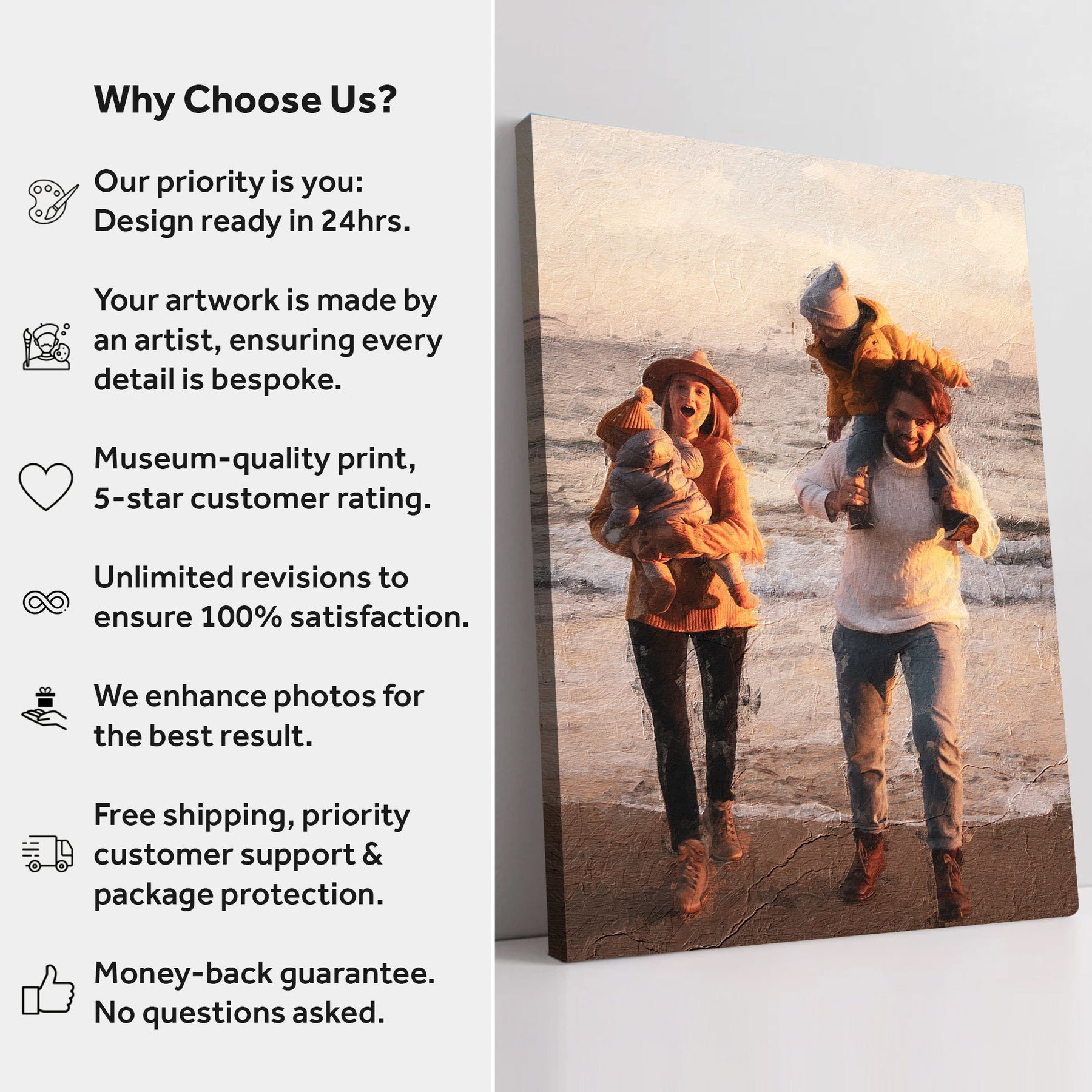 All you need to do is provide us with your favorite photo (via the upload button on this page, or via email instead), and we'll have our team create the most beautiful portrait you've ever laid your eyes on. It'll be like turning your favorite moment in time into a beautiful masterpiece to be shared with loved ones FOREVER.