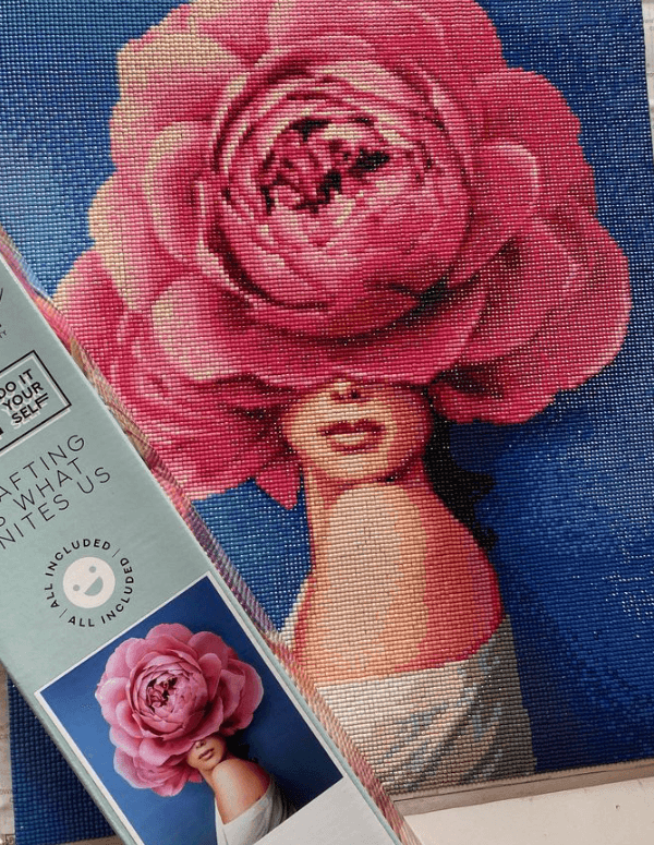 The diamond painting kit Crafting Spark contains: high quality self-adhesive canvas with printed detailed design chart; tweezers, stylus, dry glue pad and two craft trays; reusable zip lock bags with pre-sorted square acrylic diamonds in extra quantity.