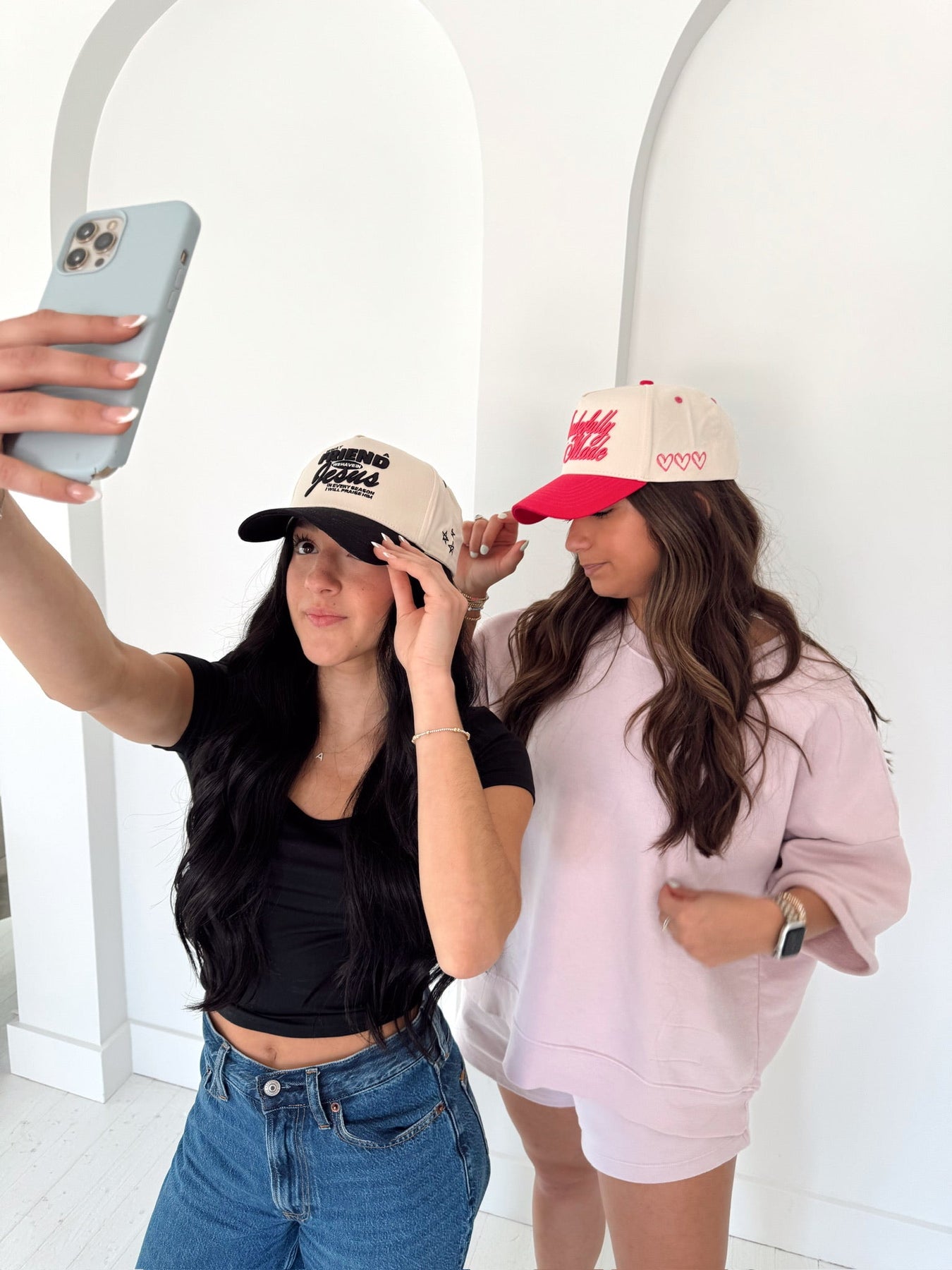 - Vintage black trucker hat with adjustable snapback & side embroidery