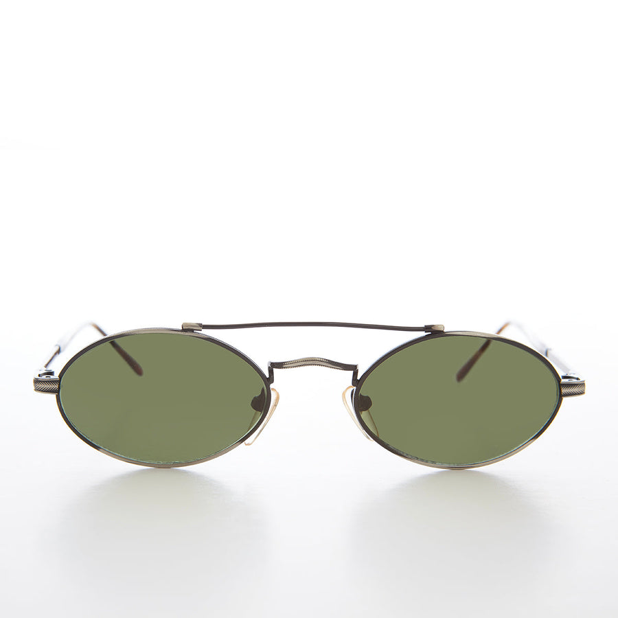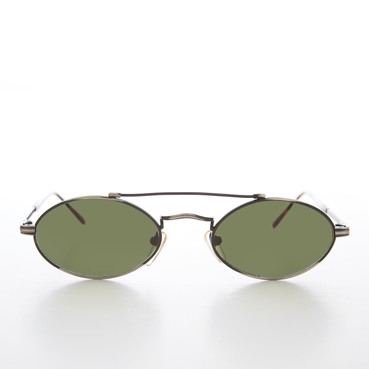 This sleek and streamlined sunglass features an oval frame and brow bar and acetate/metal combination temples. This frame is prescription friendly too. New old stock. Never worn. Great condition. UV protection.
