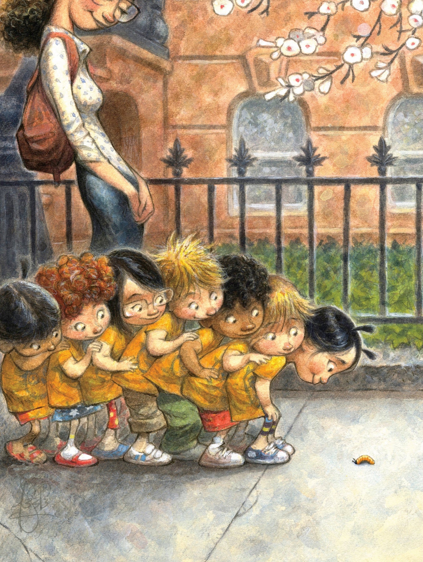 A line of children curiously observes a small worm, traveling inch by inch across the sidewalk.