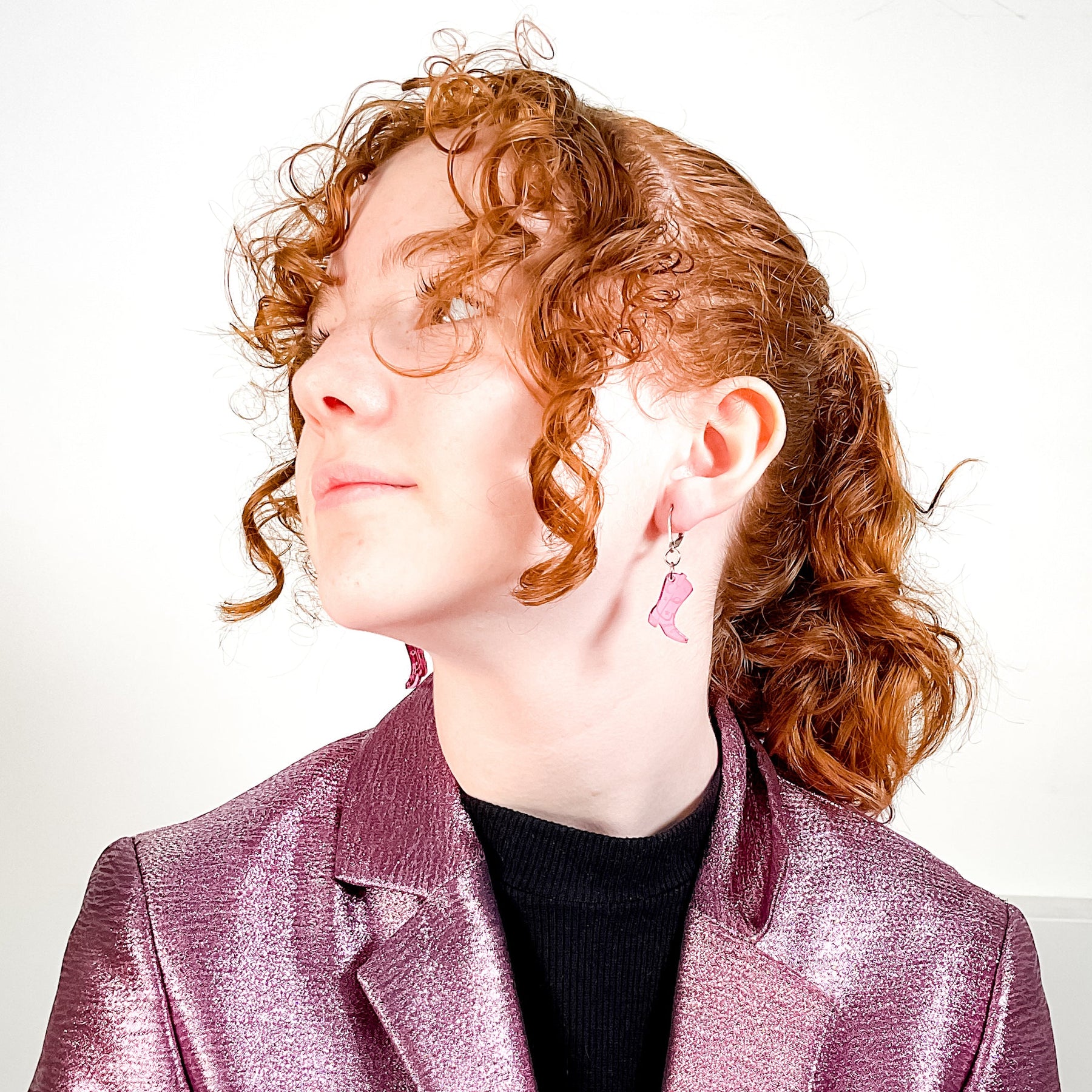 Express your country side with our super shiny mirror pink Lil Space Cowboy Boot Earrings!