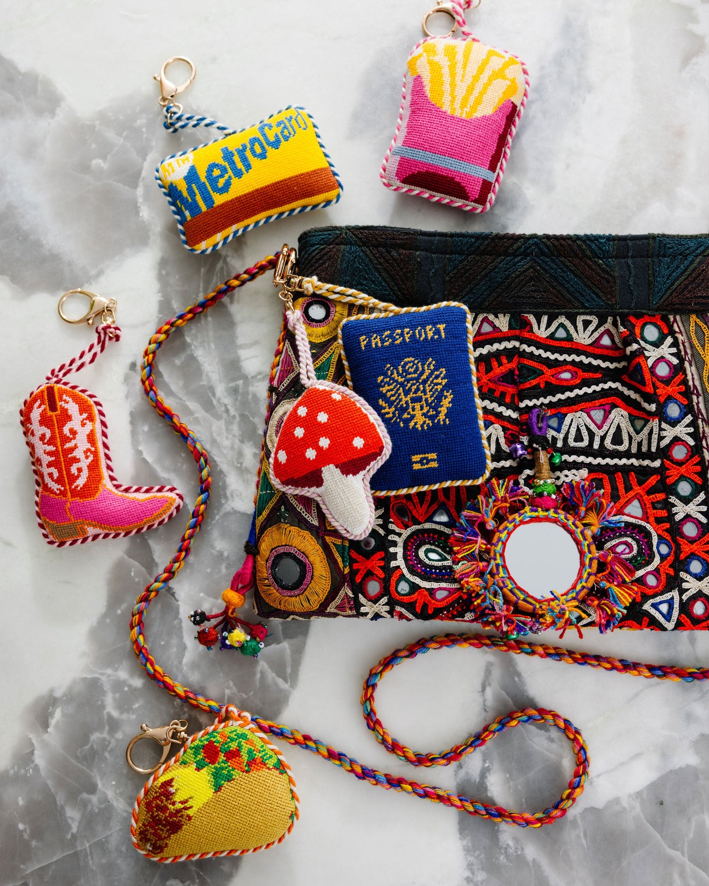 For the ones who know that accessories should never be boring. These needlepoint bag charms are for those who say, ‘Why blend in when you can carry a tiny taco?’ Whether it’s a taxi, a Stanley cup, or something cheeky, clip on your personality and let your bag do the talking.
