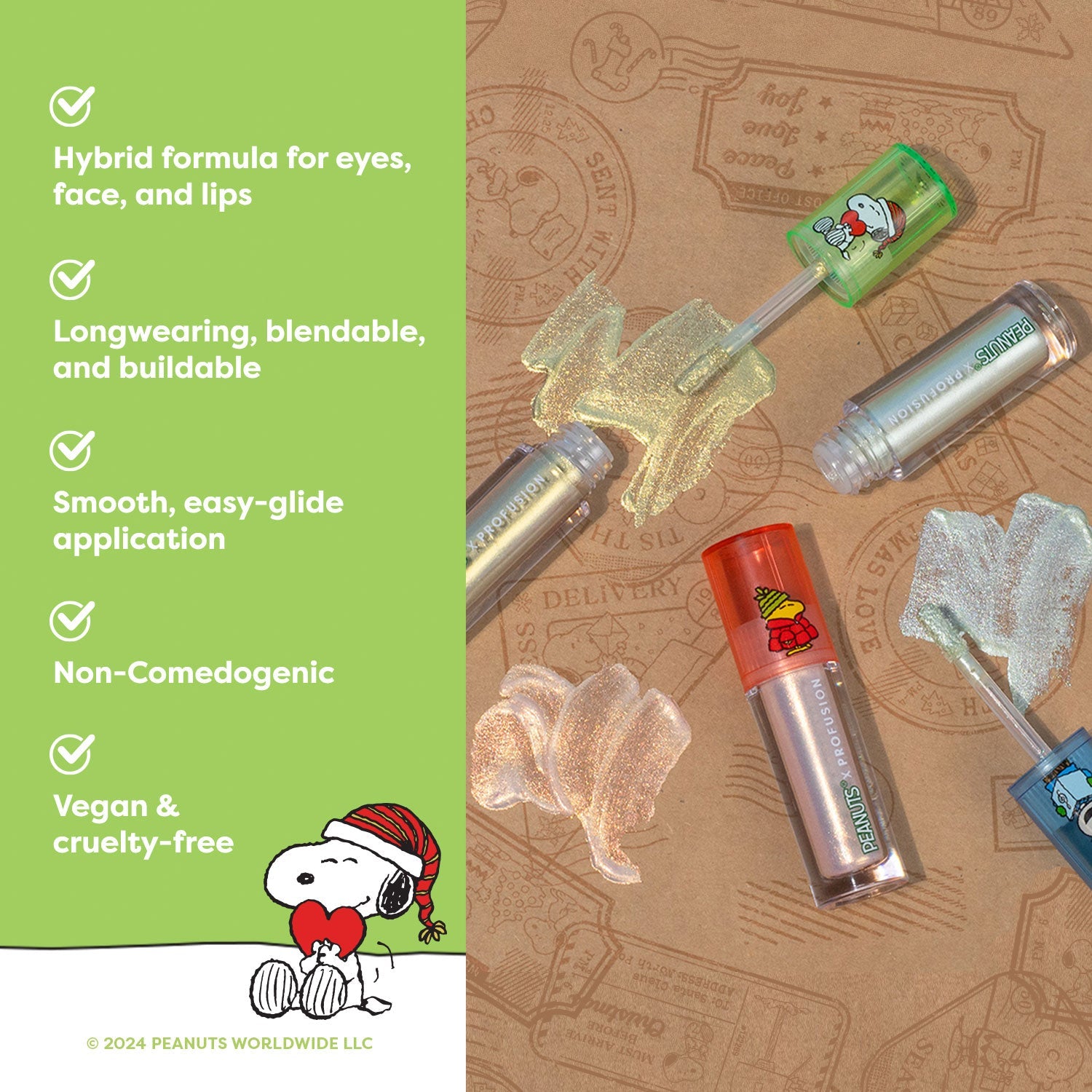 1. Pick Your Holiday Shine: Choose the chrome topper that’ll make you sparkle like the lights on Snoopy’s doghouse! It’s perfect for your eyes, cheeks, or lips.