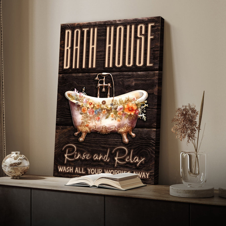 Unwind and rejuvenate in style with the Rinse And Relax Bath House Wall Art gracing your bathroom walls. The artistic design evokes a sense of calmness, making your bath time a truly indulgent experience. Hang this canvas sign near your bathtub to create a serene atmosphere, allowing you to forget the worries of the day and immerse yourself in relaxation.