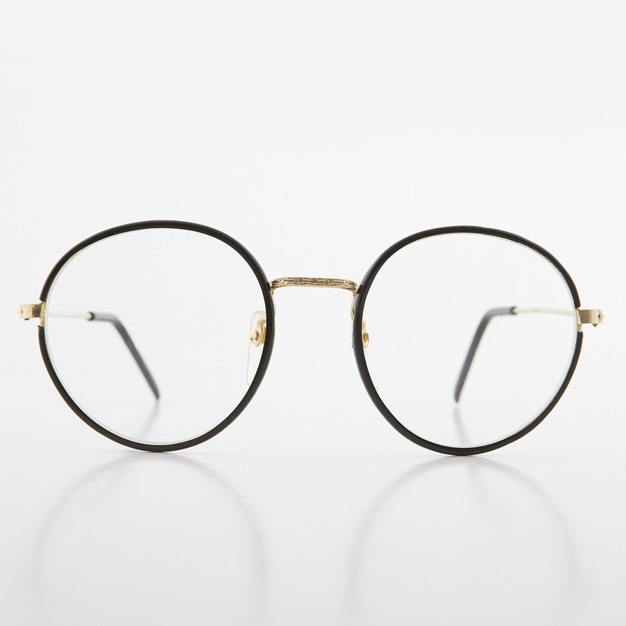 Attractive gold, round frame wrapped glasses. These eye-catching eyeglasses have an embossed metal nose bridge and black temple tips. Perfect for a sophisticated, timeless and classic look. Fake glasses with clear lens. Not recommended for RX.