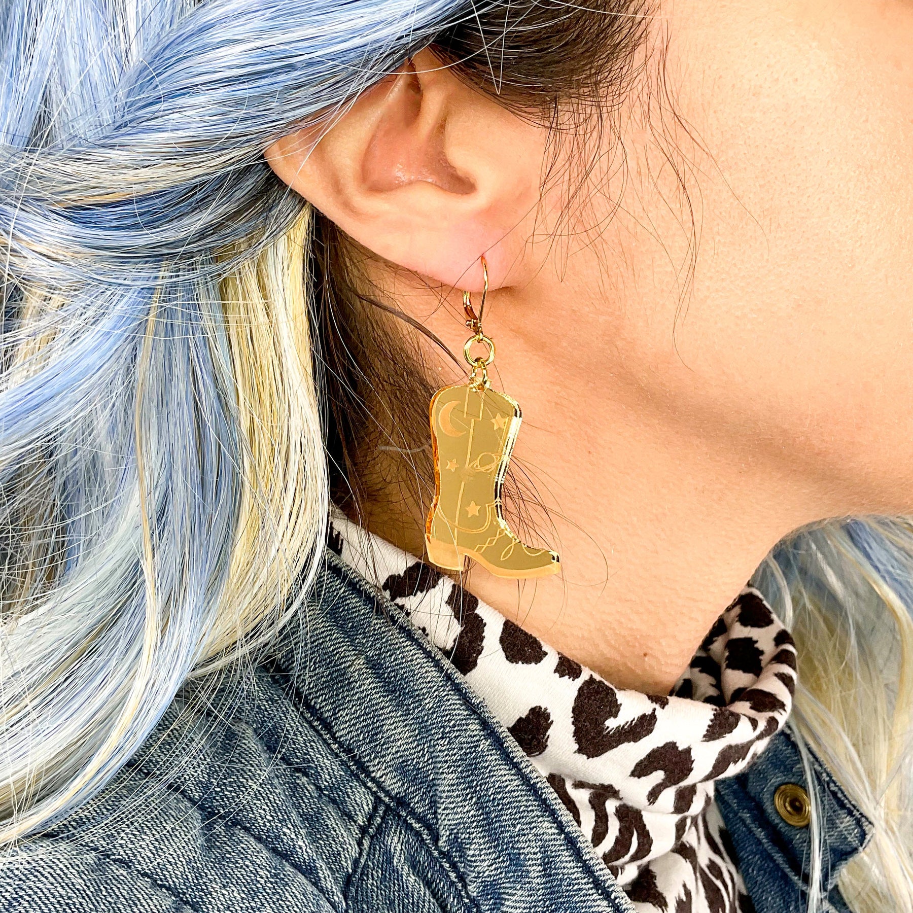 "Some people call me the space cowboy, yeah. Some call me the gangster of love..." These boots were made for those who are a little bit country and have a little bit of a space-y soul. Space Cowboy earrings are cut from mirror gold acrylic and etched with all of your favorite Vinca space motifs.