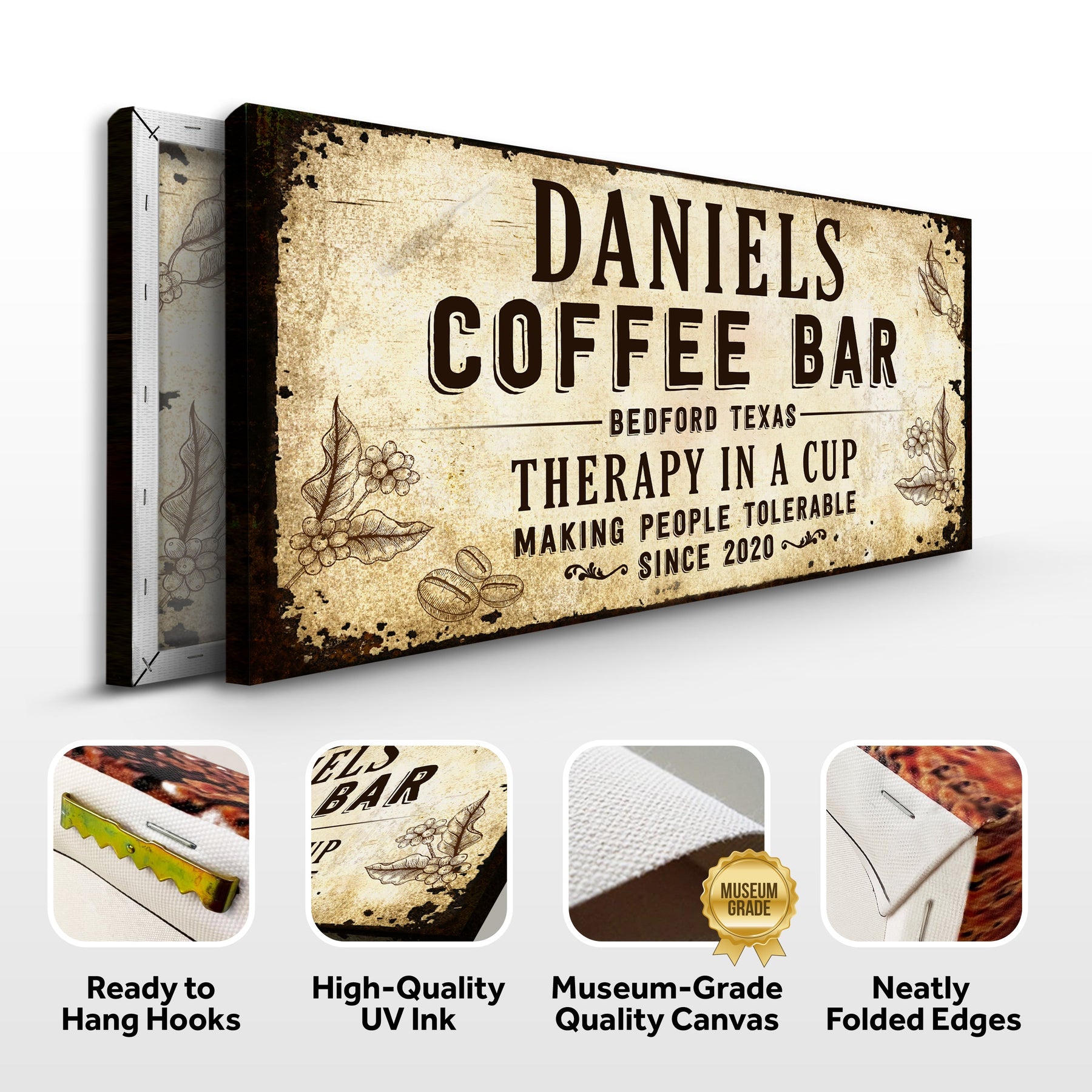 The grounded warmth of our Therapy In A Cup Coffee Business sign will give your bar a nostalgic flair. This Therapy In A Cup Coffee Bar canvas art will give a touch of rustic elegance to any environment, whether you hang it on the walls of your coffee shop or your home's kitchen. You may personalize it with your name, company logo, family picture, or a poem to remind you how much you love coffee. In either case, a piece of coffee wall art will give your space a sense of grounding and brownness. Why are you holding out? Purchase this canvas print of Therapy In A Cup Coffee Bar!