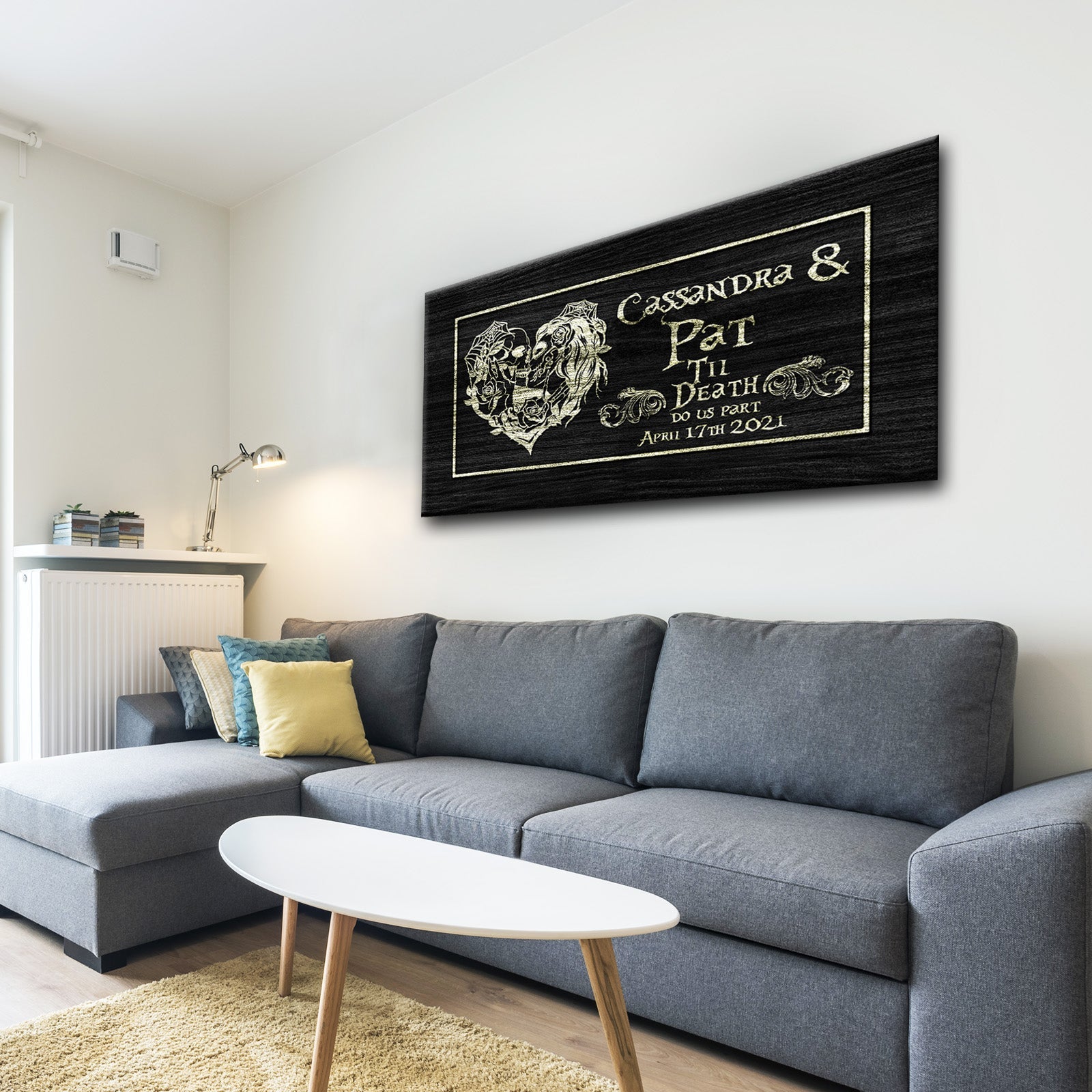 Till Death Do Us Part Skeleton Couple sign is the perfect way to show your love for skeletons and your other half. You can customize the sign by choosing from three sizes. The Till Death Do Us Part Skeleton Couple wall art is made of high-quality and durable materials. The Till Death Do Us Part Skeleton Couple canvas print is a great way to show your love for skeletons and your other half. You can display the Till Death Do Us Part Skeleton Couple canvas wall art in your home or office. The Till Death Do Us Part Skeleton Couple sign makes a great gift for skeleton lovers and fans of Till Death do us part.