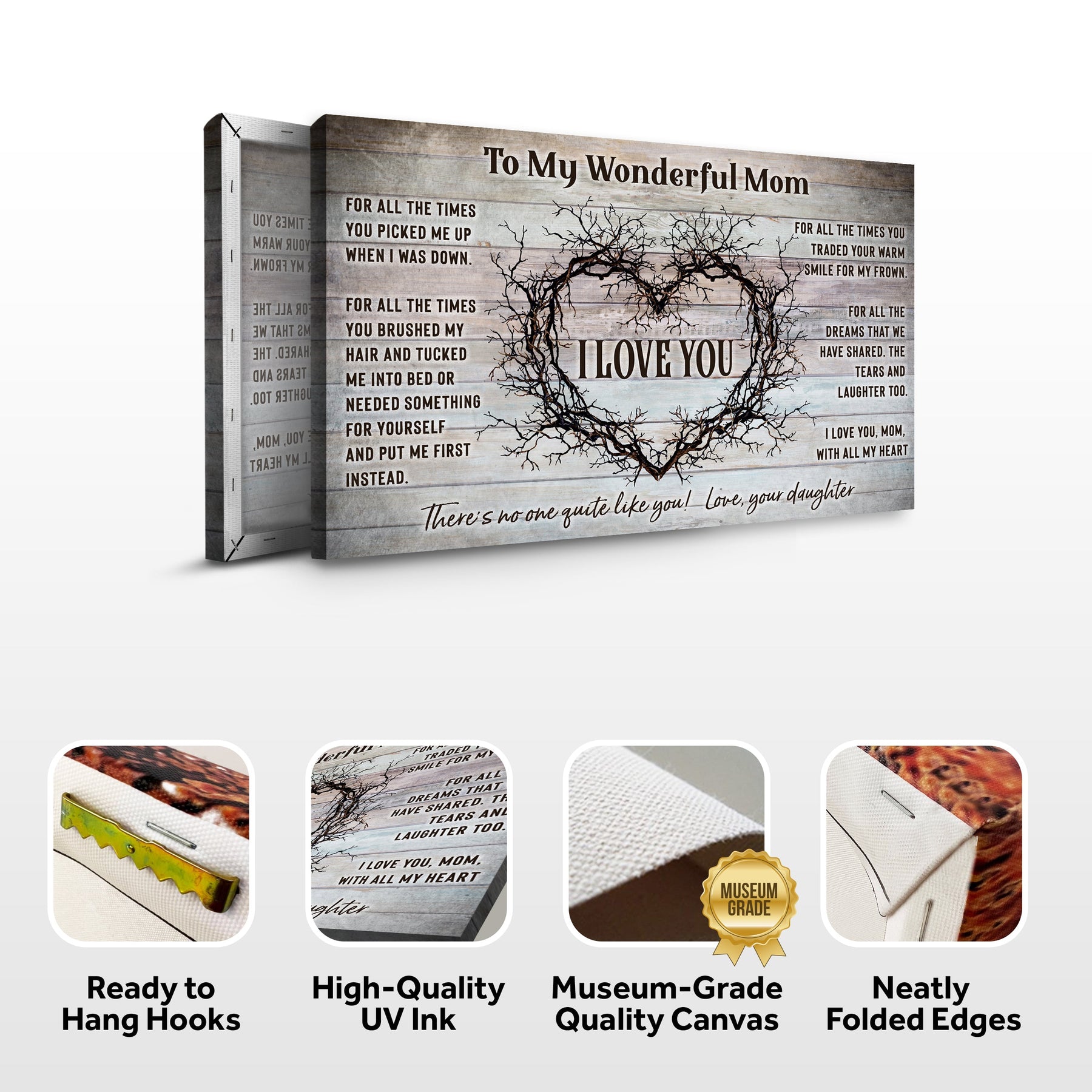 To all the mothers out there, this To My Wonderful Mom Happy Mother's Day sign is for you! To all the women who have nurtured and cared for us, this sign is for you! To all the grandmothers, aunts, sisters, and friends who had stepped in when we needed them, this sign is for you! To my own mother, this To My Wonderful Mom Happy Mother's Day wall art is for you! Thank you for always being there for me. Thank you for your never-ending love and support. I am so lucky to have you in my life! This To My Wonderful Mom Happy Mother's Day canvas print is just a small way to express how much I love and appreciate you.