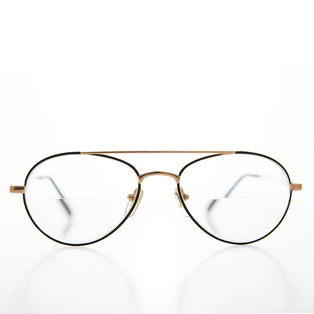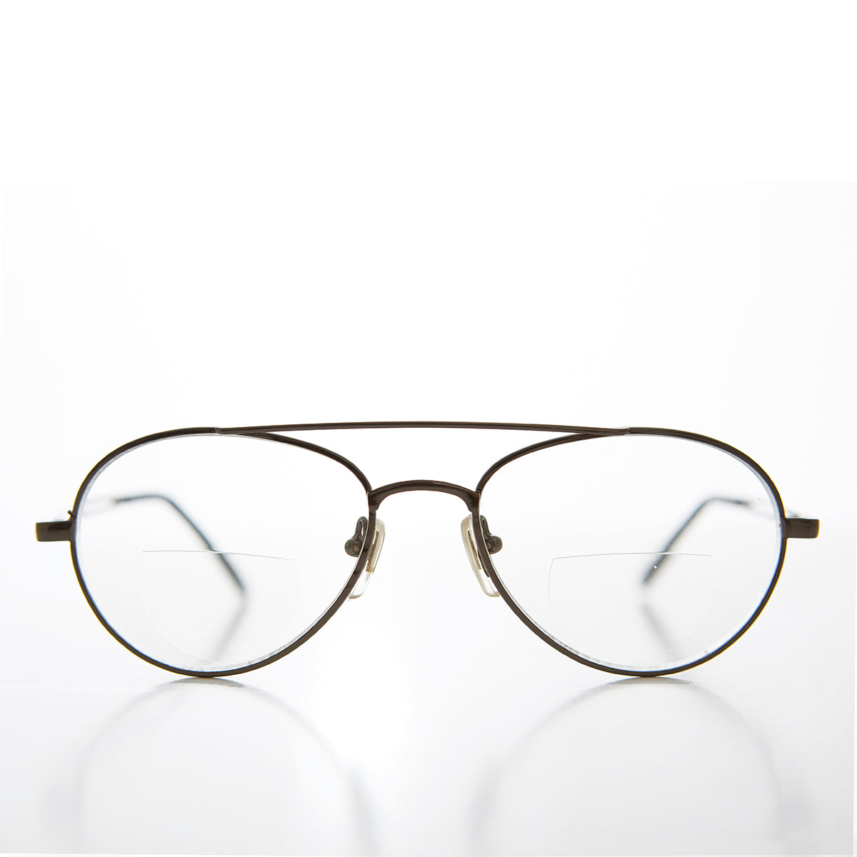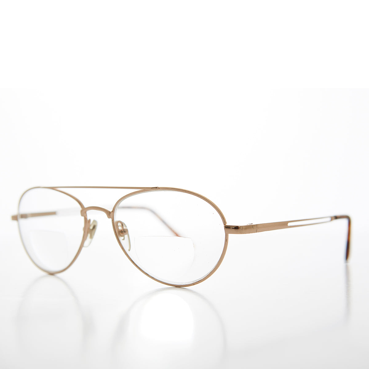 This stylish reader features a small teardrop aviator silhouette with a prescription bifocal lens. New old stock. never worn. Great condition.