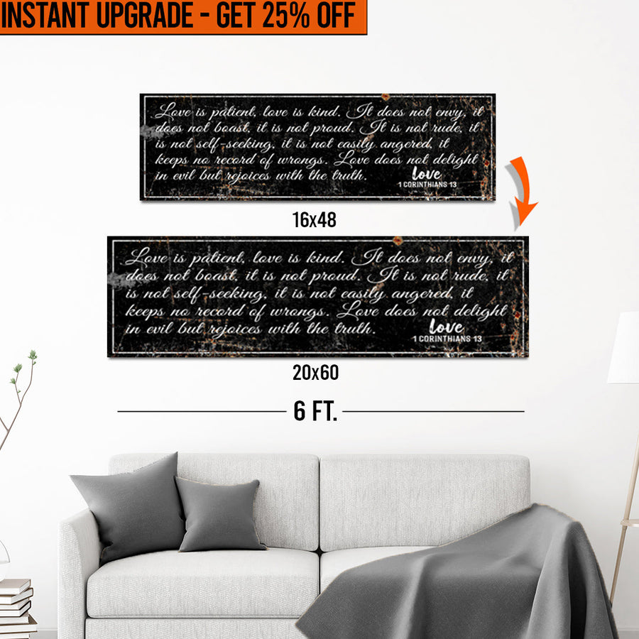 1 Corinthians 13 - Love Is Patient Rustic (Style 2) canvas that is hanging on your wall, preferably the receiving area, can be upgraded. For hassle-free canvas size changes with the same quality of thick and premium canvas, upgrade your 16x48 inches '1 Corinthians 13 - Love Is Patient Rustic' (Style 2) canvas to 20x60 inches. With seamless instant updates, you can get 25% off. Your updated 20x60 canvas will now fit to your renovation adjustments and other changes in preferences. The style remains while there are changes in the sizes for a more clearer and wider view.