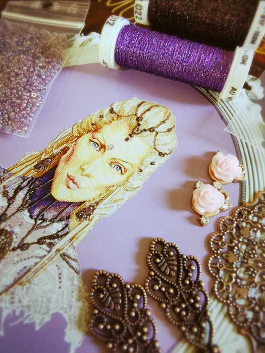 Kit contains: Lilas Linen Belfast 32 cts, 2 metallic threads Au Ver à Soie, charms, 2 bags of beads Cousines & Cie, 2 needles (embroidery + beads). Dimensions: 25x35cm / 9,84x13,78in