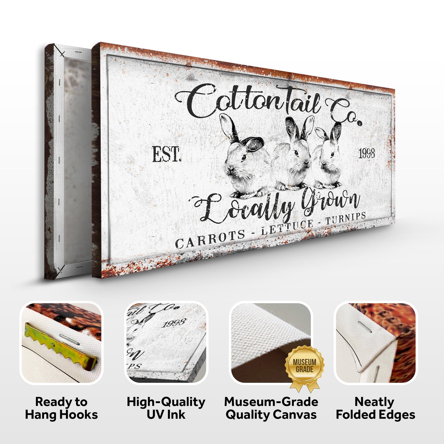 Peter Cottontail will be making his way down the bunny trail and into your home this Easter when you display this Vintage Cottontail Co Easter Sign III. This Vintage Cottontail Co Easter wall art is made of premium canvas and is hand painted in a distressed white finish with black lettering that reads, "Peter Cottontail Easter". He is also holding a carrot in his mouth. The Peter Cottontail Easter canvas wall art is in three sizes and ready to hang. Vintage Cottontail Co Easter canvas wall decor will enchant your guests this Easter when you display this Peter Cottontail Easter wall decor in your home.