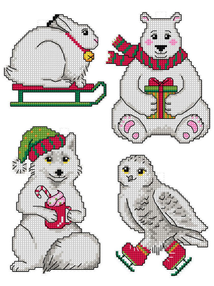 Kit contains: plastic canvas white , one sheet size 21x28cm / 8.27x11.02in /14 ct, 6-ply stranded cotton precuts (100% cotton) 10 colors, needle, chart/instruction. Dimensions set of 4 designs 10x9, 10x12, 8,5x14, 9x11 cm/3.94x3.54, 3.94x4.72, 3.35x5.51, 3.54x4.33 inches