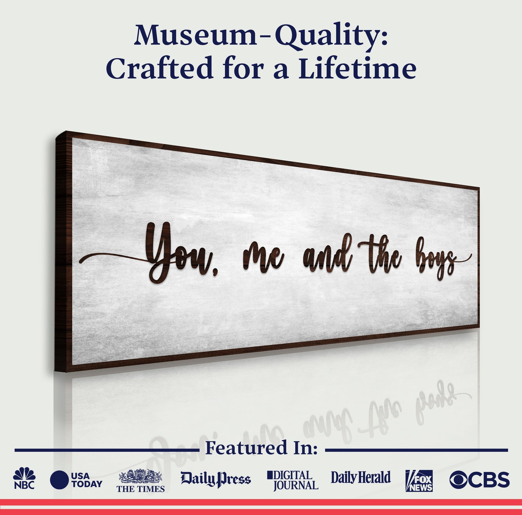 The printed design of this You, Me, And The Boys wall art is printed using UV-resistant ink on a thick premium canvas. The You, Me, And The Boys canvas wall art is ideal for creating an artistic ambiance in your living room or dining room area. Visit our collection choices of You, Me, And The Boys sign right now to pick the one that best suits you and your home.